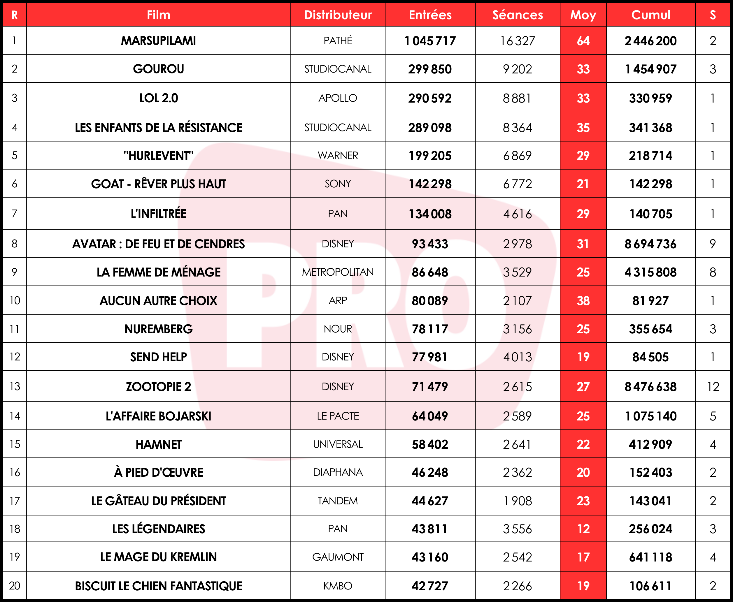 La nouveauté qui réalise la meilleure performance à la séance est Aucun autre choix de Park Chan-wook, avec 80 000 curieux pour 38 e/s. Il s’agit de la meilleure moyenne obtenue par ARP sur un premier week-end depuis 2021, devant les 29 e/s de Priscilla. Dernière sortie du top 20, Send Help rallie près de 78 000 spectateurs (84 000 avec AP). À noter enfin, hors classement, les 23 e/s (pour 30 700 entrées) de Les Dimanches, chez Le Pacte, et des 33 e/s (pour 11 500 entrées) de Soulèvements, chez Jour2Fête.