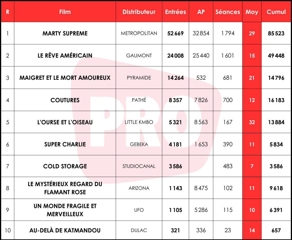 La raquette ne tremble pas pour Marty Supreme qui boucle son premier jour à 52 600 entrées (85 000 avec AP), pour une solide moyenne de 29 entrées par séance (e/s). Le long métrage effréné de Josh Safdie se lance bien mieux que Smashing Machine, de son frère, Benny Safdie, qui, en octobre dernier, avait démarré à 9 000 spectateurs pour 8 e/s (cumul à 87 000). Côté films d’auteurs étasuniens d’envergure, la sortie de Metropolitan dépasse Babylon de Damien Chazelle (50 000 entrées pour 26 e/s, cumul à 1,5 M), Killers of the Flower Moon de Martin Scorsese (47 500 entrées pour 29 e/s, cumul à 1,2 M) et Une bataille après l’autre de Paul Thomas Anderson (44 800 entrés pour 22 e/s, cumul à 1,5 M). Les étoiles semblent donc alignées pour la nouvelle prestation de Timothée Chalamet, qui jouit en outre d’excellents retours sur AlloCiné, presse (4,2) comme spectateurs (4).