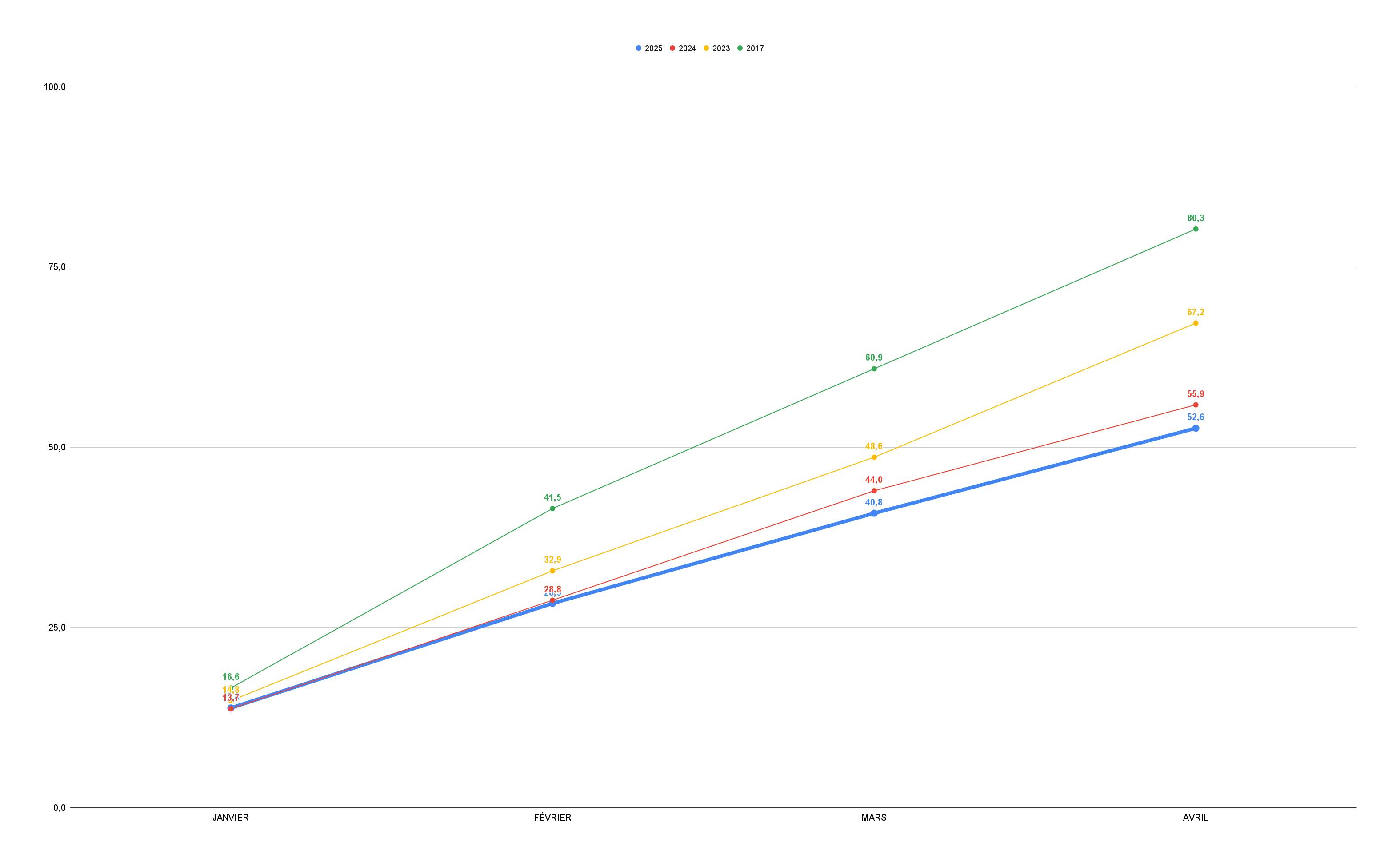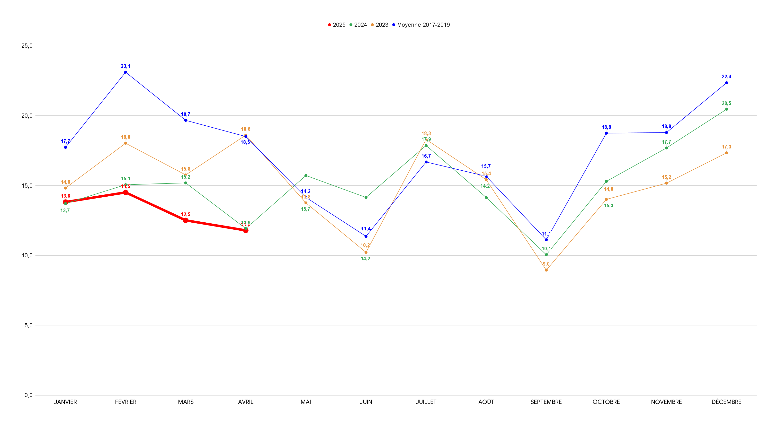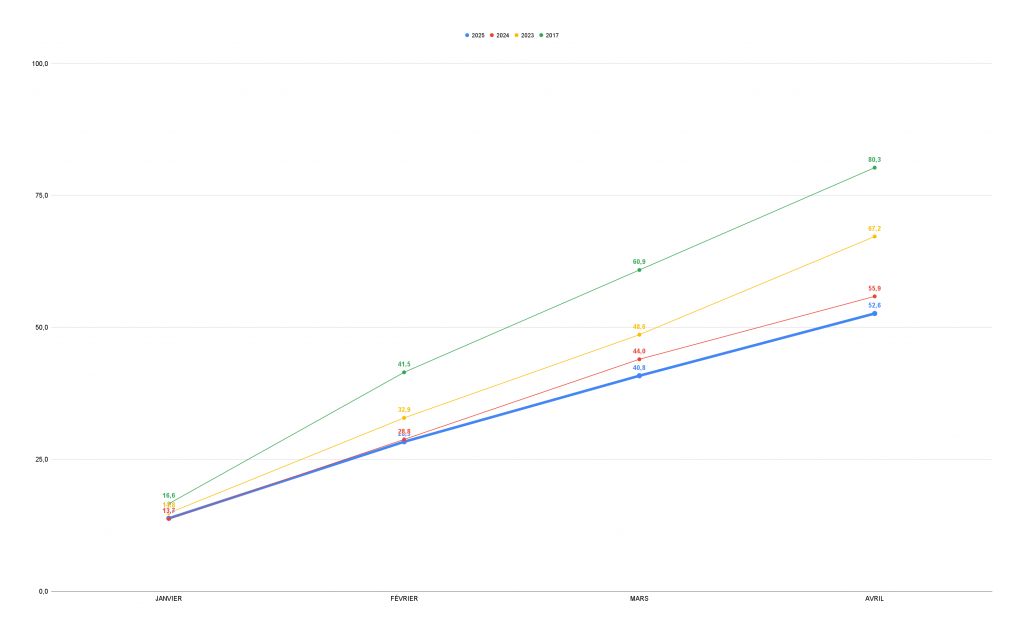 Dans la continuité du premier trimestre, le quatrième mois de 2025, loin de son dynamisme pré-pandémique, accentue son retard par rapport à 2023 et 2024.