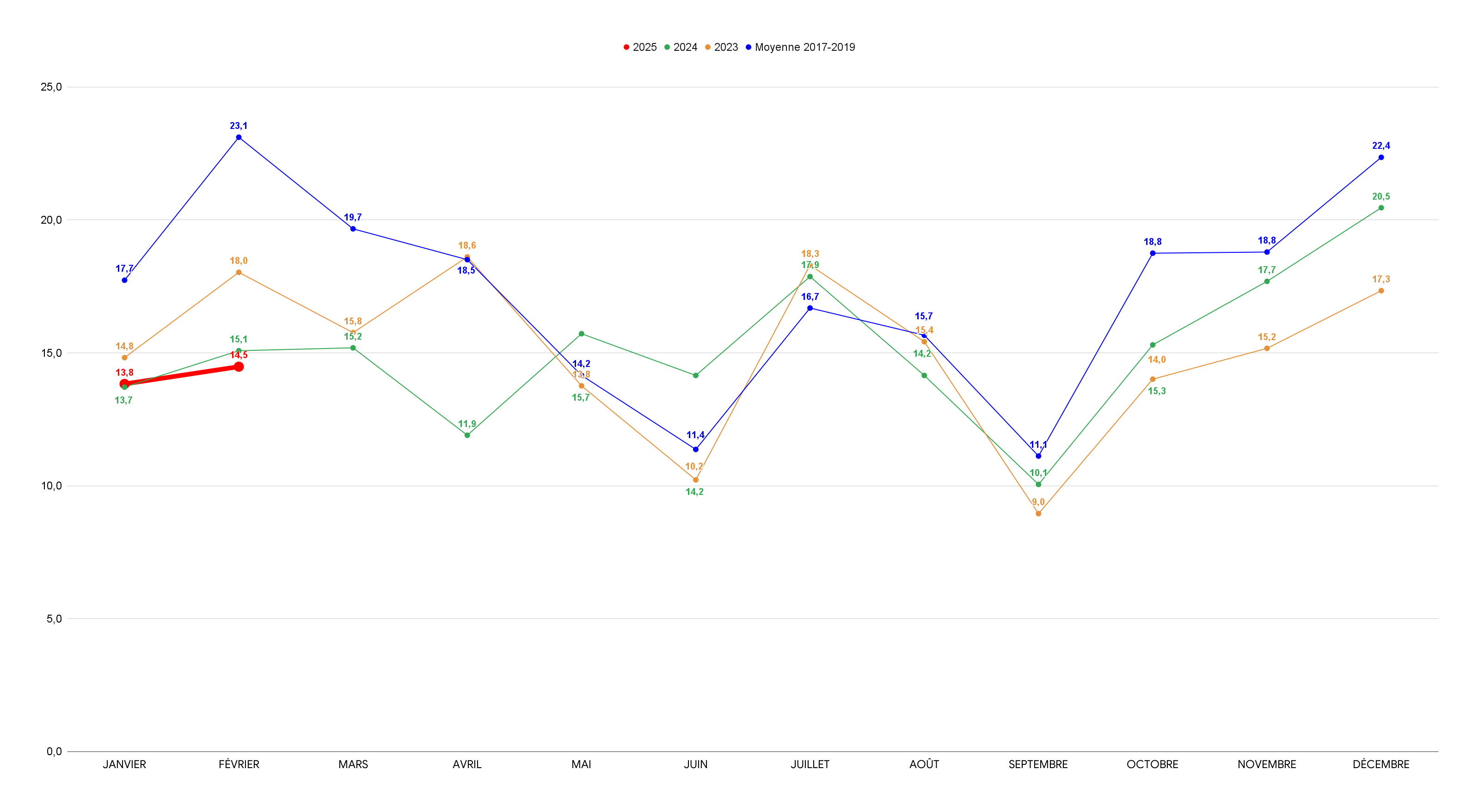 Au total, 56 long-métrages inédits sont sortis en février ; 7 américains et 29 français, contre respectivement 3 et 34 films le même mois, en 2024. Sur l’année glissante (mars 2024 à février 2025), 180,5 M de tickets ont été écoulés, contre 176,33 M sur la période mars 2023-février 2024. Les deux premiers mois de 2025 totalisent près de 28,3 M de billets ; un résultat en recul de 1,74 % au déjà difficile début d’année 2024, et de 13,9 % par rapport à 2023.