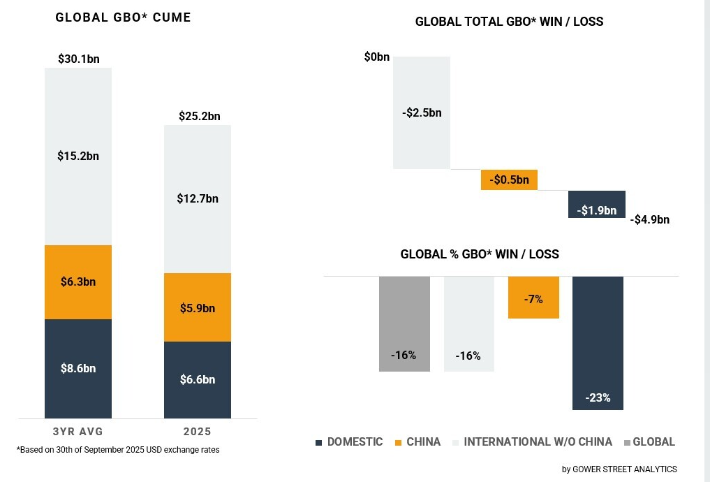 Au global, 2025 en est à 25,2 Md$, soit un résultat inférieur de 16 % à 2017-2019 (30,1 Md$). Avec 6,6 Md$, les États-Unis sont, pour l’instant, le marché le plus en retard (-23 %), tandis que la Chine, portée par son début d’année canon grâce à Ne Zha 2, affiche un recul de seulement 7 %.