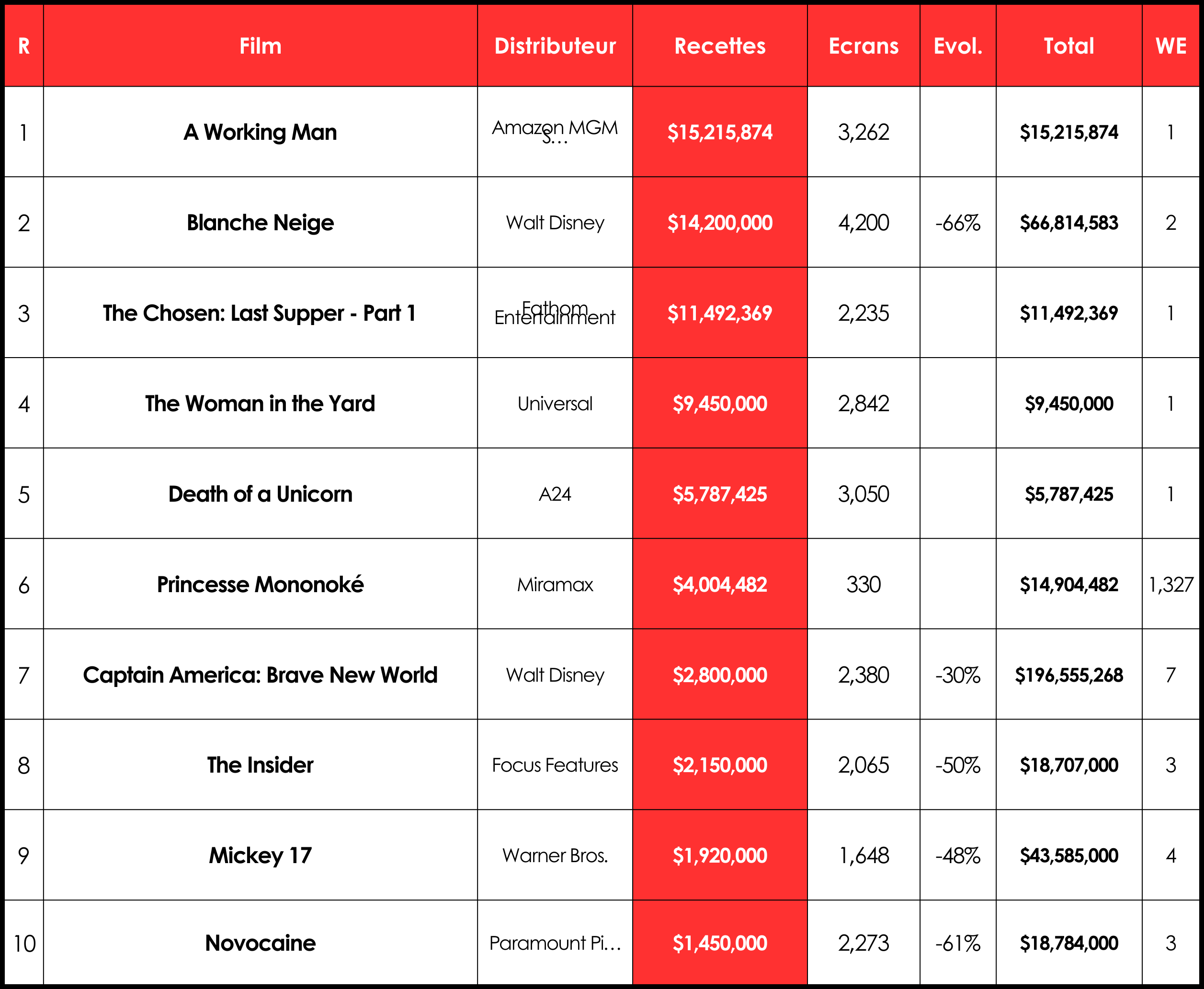 A Working Man, de David Ayer avec Jason Statham, démarre au-dessus des attentes avec 15,2 millions de dollars (M$) sur 3 262 écrans. Un démarrage équivalent à celui de Criminal Squad : Pantera en janvier dernier (15 M$), mais légèrement en-dessous du précédent film du duo Statham-Ayer, The Beekeeper, qui avait démarré à 16,5 M$ en janvier 2024, pour finir à 66 M$. Lui aussi distribué par Amazon-MGM, il était sorti en France directement sur Prime Video, ce qui pourrait être le cas de A Working Man, sachant qu’aucune date n’est prévue dans l’Hexagone.