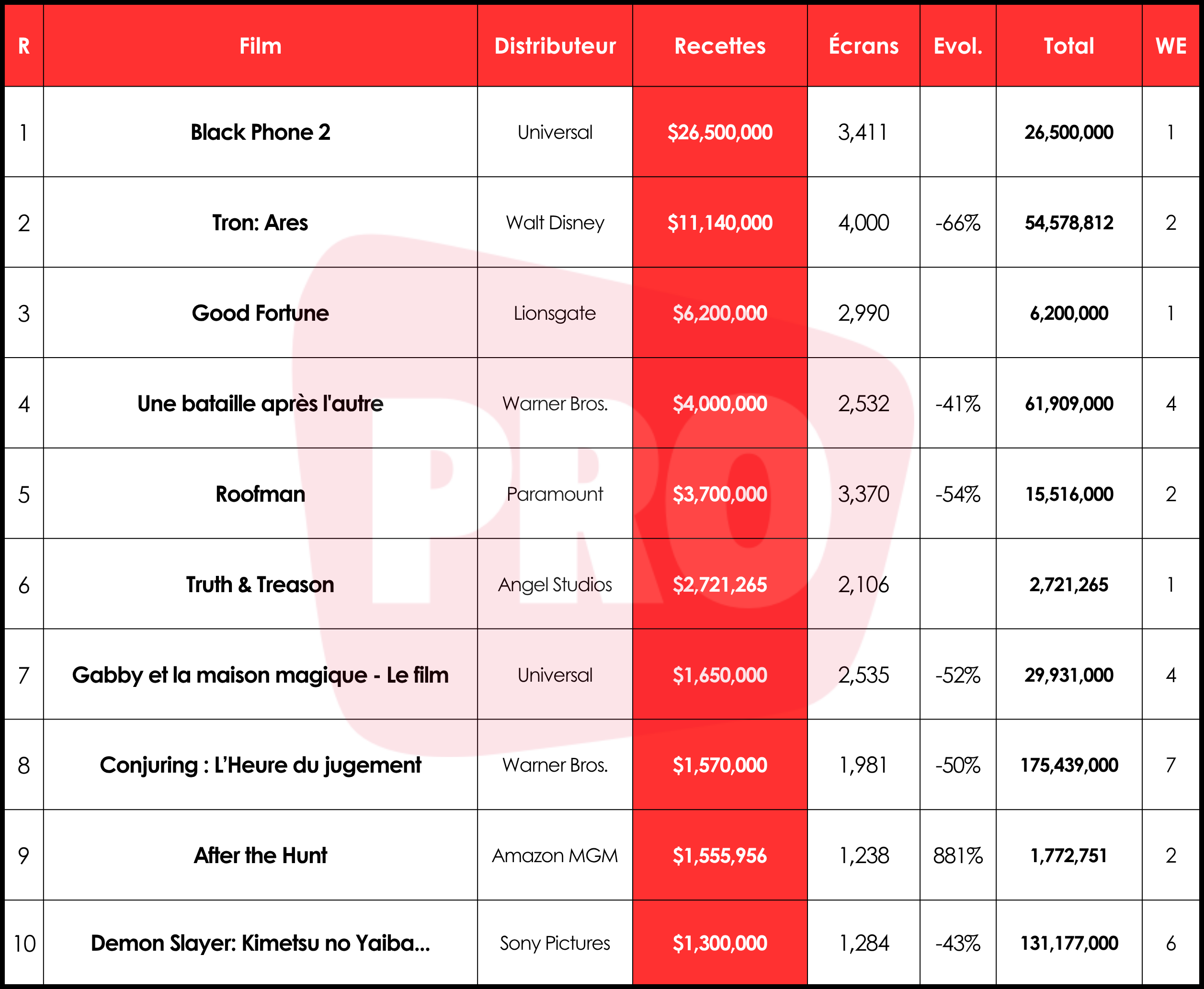 Joli démarrage pour Black Phone 2, par le spécialiste Scott Derrickson et avec Ethan Hawke, qui prend la tête du classement avec 26,5 millions de dollars (M$) dans 3 411 salles, faisant mieux que le premier opus en 2022 (23,6 M$). Pour un film d’horreur Blumhouse, c’est le meilleur lancement depuis celui de Five Nights at Freddy’s en 2023 (80 M$). À l’international, le nouveau Black Phone a engrangé 15,5 M$ sur 72 territoires, devançant partout le premier épisode, sauf en France où il arrive 4e parmi les nouveautés.