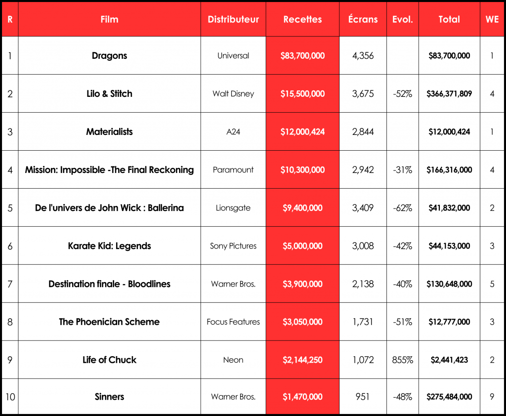 Au total, le box-office du week-end est estimé à 151,7 M$, soit une hausse de 25,3 % par rapport à la semaine dernière. On est toutefois en recul de 29,1 % par rapport au week-end équivalent de 2024, les chiffres de Dragons n’étant pas à la hauteur de ceux de Vice-Versa 2 l’année dernière.