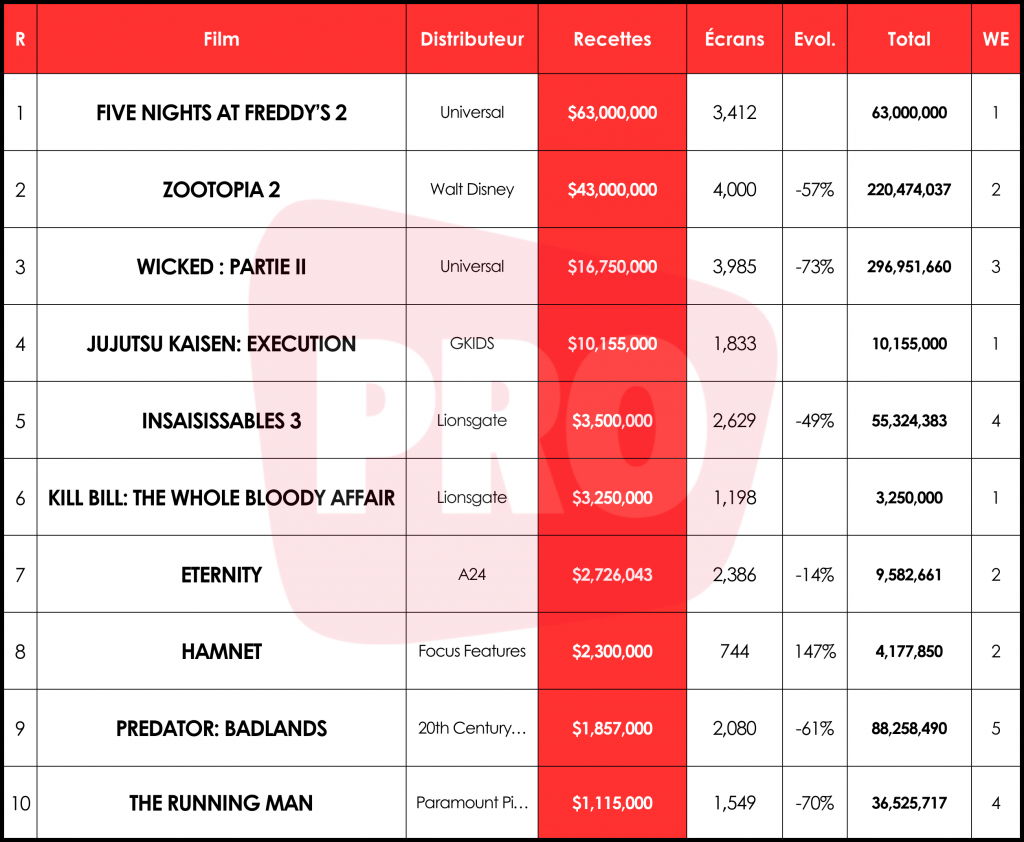 Five Nights at Freddy’s 2 d’Universal/Blumhouse a déjoué les attentes avec un démarrage estimé à 63 millions de dollars (M$) sur 3 412 écrans, soit une moyenne de 18 464 $ par écran. Une performance qui reste en deçà des 80 M$ enregistrés par le premier opus il y a deux ans – qui sortait pourtant simultanément sur ma plateforme Peacock d’Universal –, mais suffisante pour dominer Zootopie 2 sur sa deuxième semaine. Five Nights at Freddy’s 2 réalise ainsi le deuxième meilleur démarrage d’un film d’horreur en 2025, derrière Conjuring : L’Heure du jugement (84 M$), et le meilleur démarrage horrifique pour un mois de décembre, devant Scream 2 (32,9 M$) en 1997.