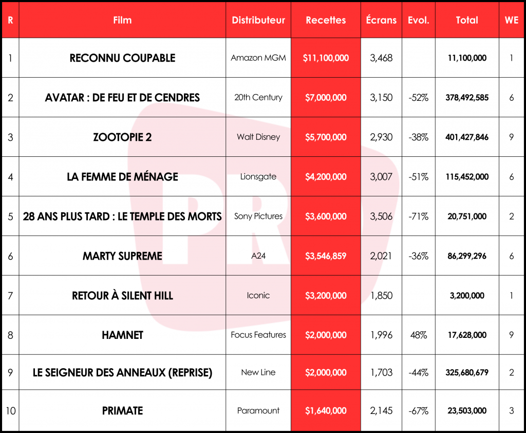 Avec la tempête hivernale qui sévit en Amérique du Nord, de nombreuses salles sont fermées et ce week-end a été le pire depuis le début de l’année, avec seulement 53,6 millions de dollars (M$) de recettes. Dans ce contexte et parmi le peu de sorties, c’est Reconnu coupable, de Timur Bekmambetov avec Chris Pratt, qui s’en sort le mieux avec 11,2 M$ dans 3 468 salles. Sans être fracassant, ce démarrage est conforme aux prévisions et surtout, il suffit à ravir la première place du classement au film de James Cameron, après ses cinq semaines de règne. C’est aussi le premier succès de l’année pour Amazon MGM, qui a produit le film et le distribue aux États-Unis.