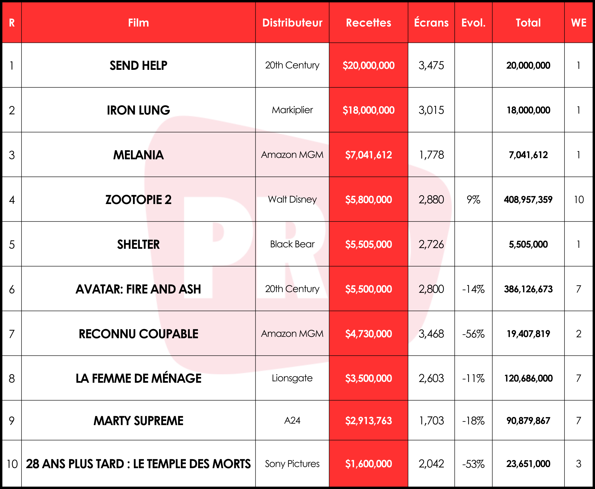 Parmi les continuations, Zootopie 2 progresse de 9 %, tandis que Reconnu coupable, en tête la semaine dernière, perd 56 %. Au total, le box-office de ce week-end atteint 82,5 M$, soit +35,1% par rapport à 2025.