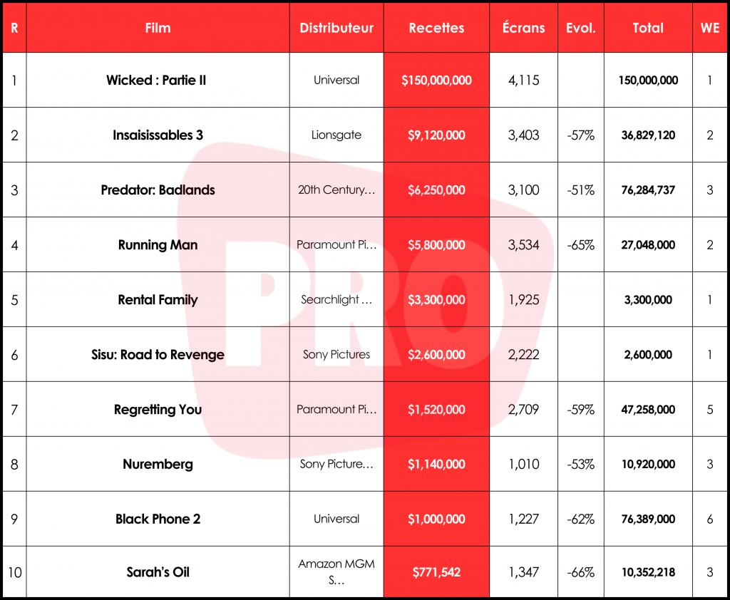 Wicked : partie II s’élance avec magie, avec 150 millions de dollars (M$), dans 4 115 salles américaines. Il dépasse les 112,5 M$ de la première partie, sortie en novembre 2024, et signe aussi le 2e meilleur lancement de l’année 2025, derrière Minecraft et ses 162,7 M$. Aux États-Unis, les salles PLF représentent 40 % des recettes du week-end.
