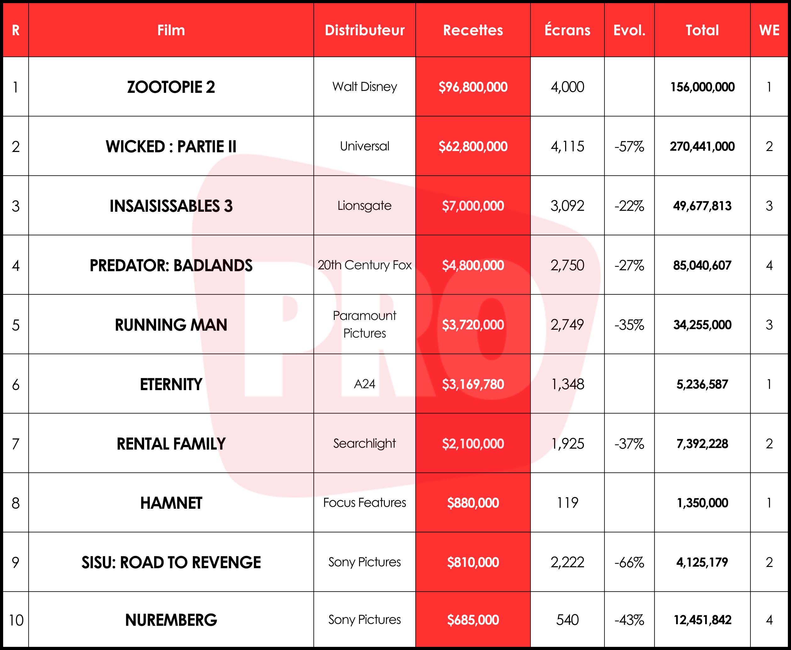 En deuxième position, Wicked : Partie II chute de 57 % et enregistre 62,8 M$. Une baisse bien plus importante que le premier volet (-28 %), probablement due à une surperformance du premier week-end en raison du nombre de spectateurs anticipant la sortie de Zootopie 2. Cela place la suite des aventures de Glinda et Elphaba à 263,19 M$, derrière les 270,4 M$ de Wicked.