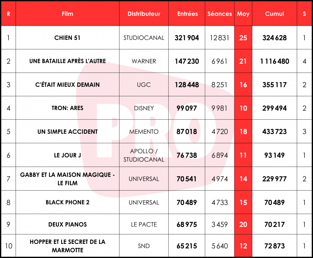 Chien 51 attire plus de 320 000 spectateurs (325 000 avant-première (AP) incluses) pour son week-end de lancement, soit une moyenne de 25 entrées par séance (e/s). S’il se hisse au cinquième rang des meilleurs démarrages pour un film français cette année, le thriller futuriste de Cédric Jimenez signe également un résultat assez proche de Bac Nord (327 000 entrées, 30 e/s, 363 000 avec AP). En revanche, il ne réédite pas la performance de Novembre et ses 460 000 tickets écoulés (40 e/s et 500 000 avec AP). Autre dystopie tricolore, Le Règne animal s’élançait à 168 000 billets (24 e/s, 180 000 avec AP).