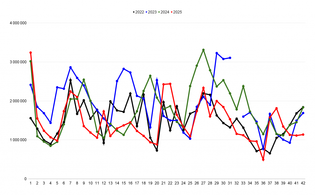 Au total, le top 10 a généré 1,14 million d’entrées, contre 1,1 million le week-end précédent (+2 %). En revanche, les performances à la séance baissent (16 e/s en moyenne contre 21 e/s). Par rapport aux années précédentes, ce week-end 2025 reste bien loin des résultats affichés en 2022, 2023 et 2024 (voir graphique ci-dessous).