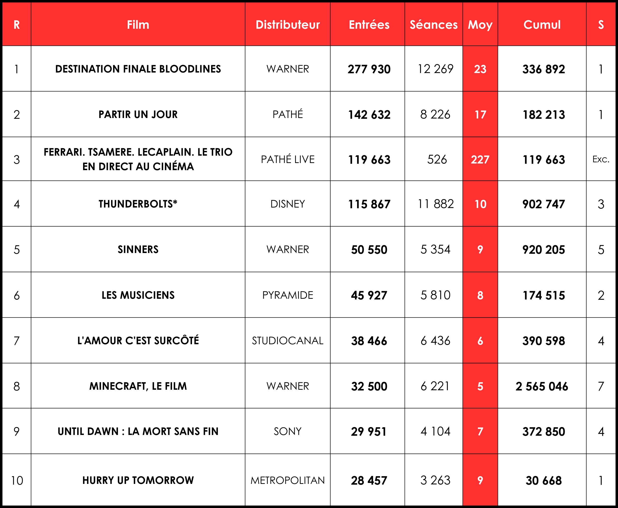 Destination Finale : Bloodlines écoule 277 000 tickets (336 000 avec AP) pour 23 entrées par séance (e/s). Un démarrage similaire à celui de Sinners (239 000 entrées pour 27 e/s), mais inférieur à Alien : Romulus (384 000 entrées pour 33 e/s), du côté des récentes sorties horreur. Le sixième volet de la saga se classe à la 11e place des meilleurs premiers week-ends de l’année, fort de la sixième meilleure combinaison de séances de sortie (12 269 séances).
