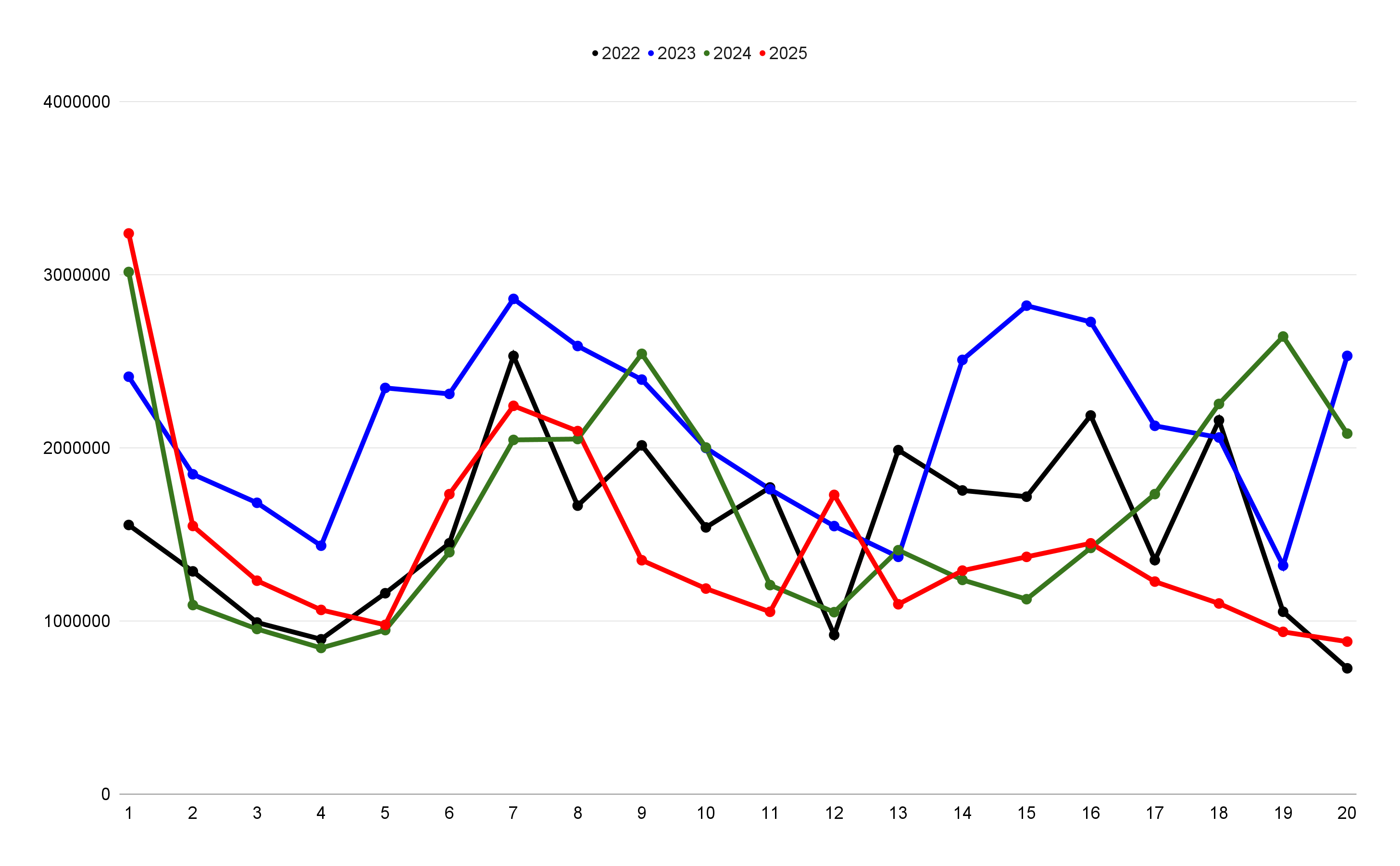 Avec une baisse de 57 % en moyenne, les continuations du top 10 font triste mine, Sinners affichant la meilleure tenue avec une perte de fréquentation de 52 %… Aucune d’entre elles ne dépasse également les 10 e/s, à l’exception de Thunderbolts*. Cette mauvaise forme se traduit dans la performance à la séance globale du classement, qui est – hors visa exceptionnel – de 10 e/s, soit le plus bas niveau enregistré depuis 2021. Également, avec 881 000 tickets écoulés, le top 10 atteint son plus faible total depuis la semaine du 24 janvier 2024.