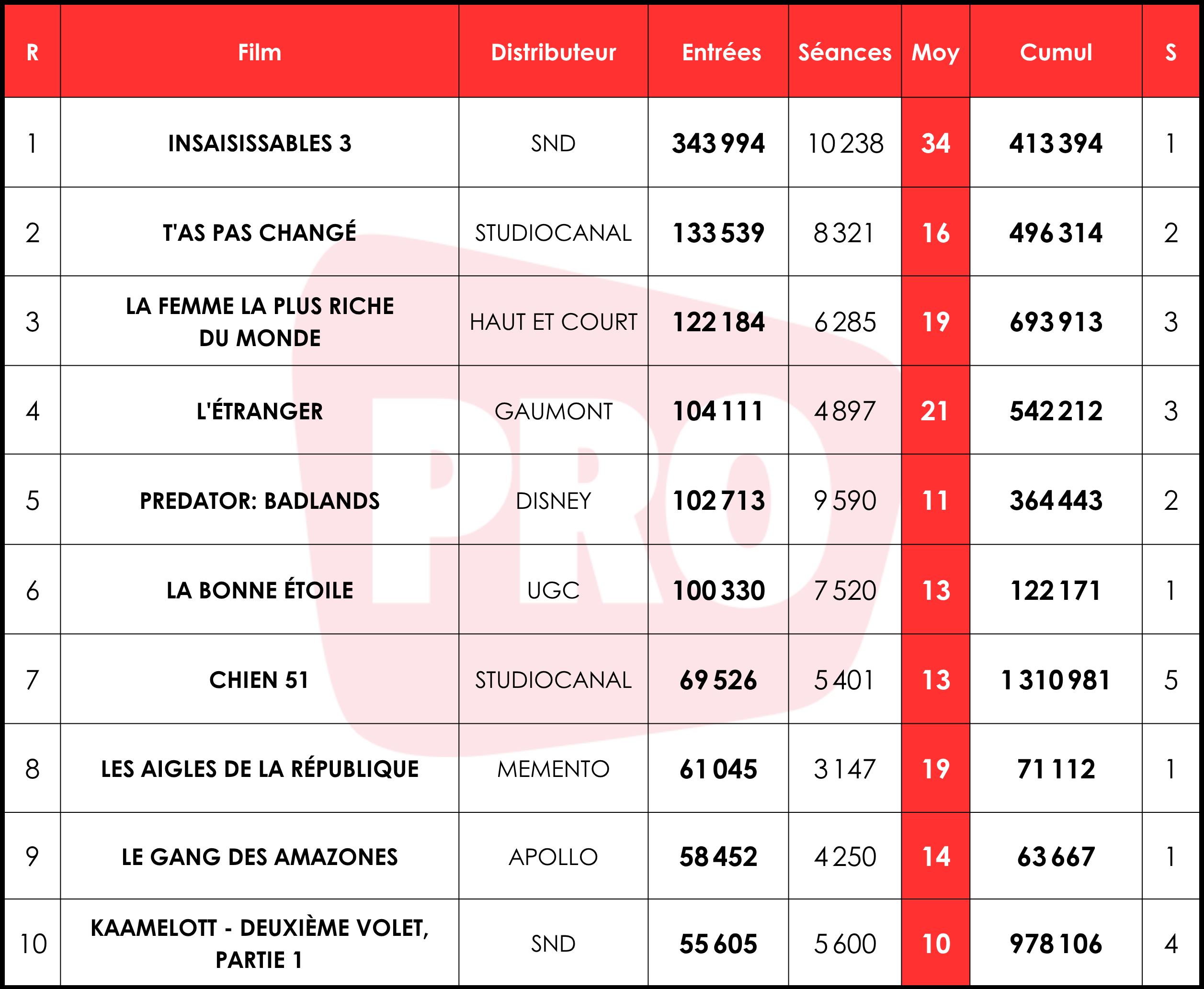 Insaisissables 3 de Ruben Fleischer attire 344 000 spectateurs pour son premier week-end, soit une solide moyenne de 34 entrées par séance (e/s) ; le film cumule 414 000 tickets avec avant-premières (AP). C’est le deuxième meilleur lancement de l’année pour son distributeur SND après Kaamelott – Deuxième volet (partie 1). Au sein de la franchise, ce troisième opus démarre toutefois bien en dessous des deux précédents, qui affichaient plus de 700 000 billets avec AP. À titre de comparaison, fin 2021, S.O.S. Fantômes : L’Héritage embarquait 228 000 curieux (20 e/s) et quelque 255 000 avec AP.