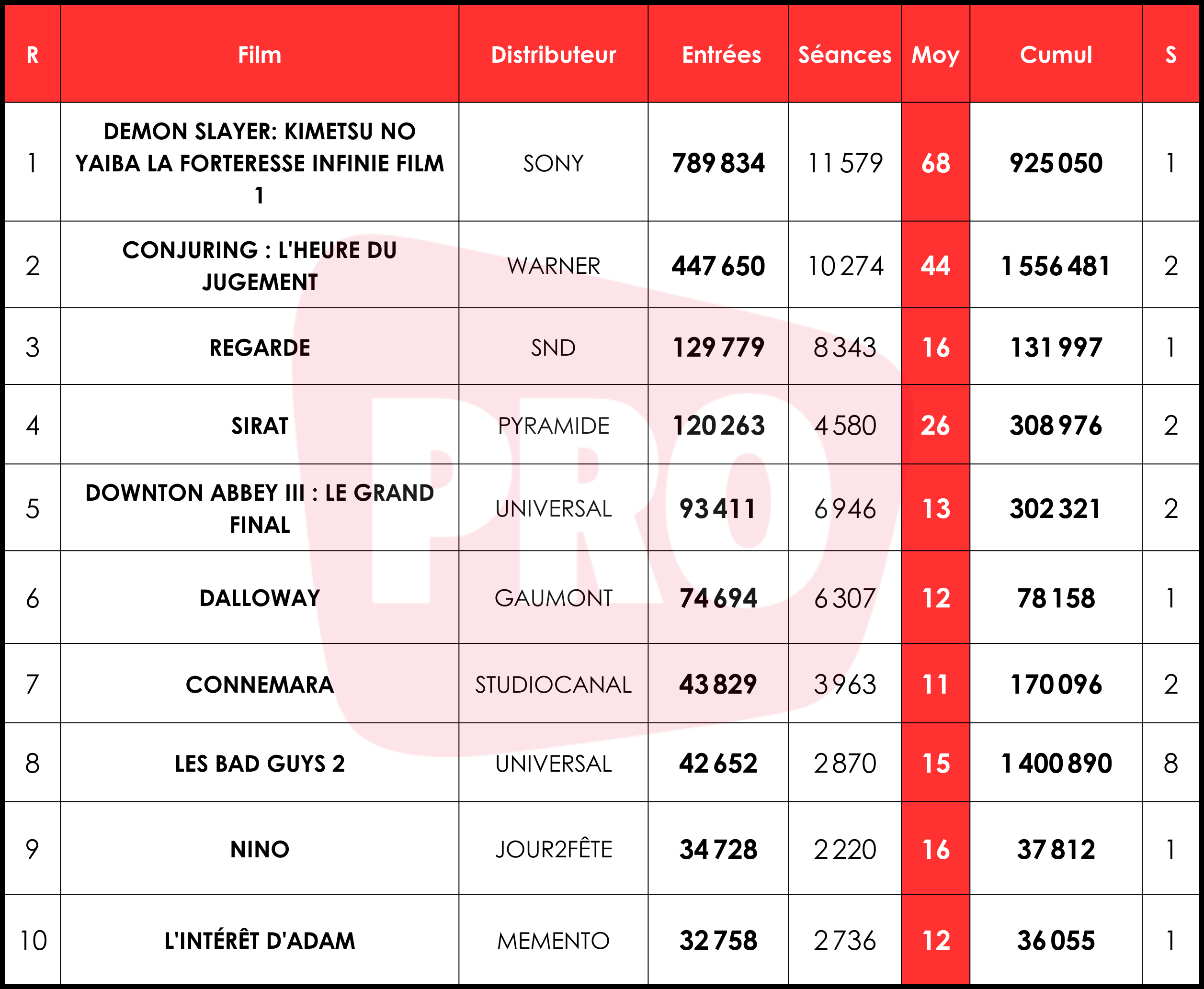 Après le rebond record de la semaine dernière, le classement grimpe encore de 15 %, aidé par la performance de Demon Slayer, et la continuation de Conjuring. Par rapport à la même période de 2024, et également de 2023, il réalise un résultat supérieur de 57 %.