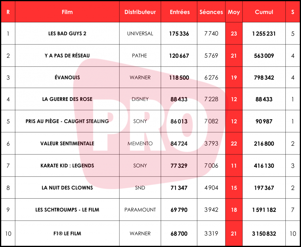 175 000 entrées pour Les Bad Guys 2, pour un cumul à 1,2 million (M) et, désormais, une 15e place au rang des plus grands succès de 2025. Malgré une diminution de 4 % de ses séances, le film de Pierre Perifel boucle son week-end avec une hausse de 7 % de ses entrées, et une bonne moyenne de 23 entrées par séance (e/s). Il s’agit de la meilleure du top 10, et la deuxième meilleure pour une sortie de 2025 à plus de 1 000 séances dans sa cinquième semaine, après les 30 e/s de F1. Également, le total de ce deuxième volet a dépassé les 1,1 M du premier, sorti en 2022.