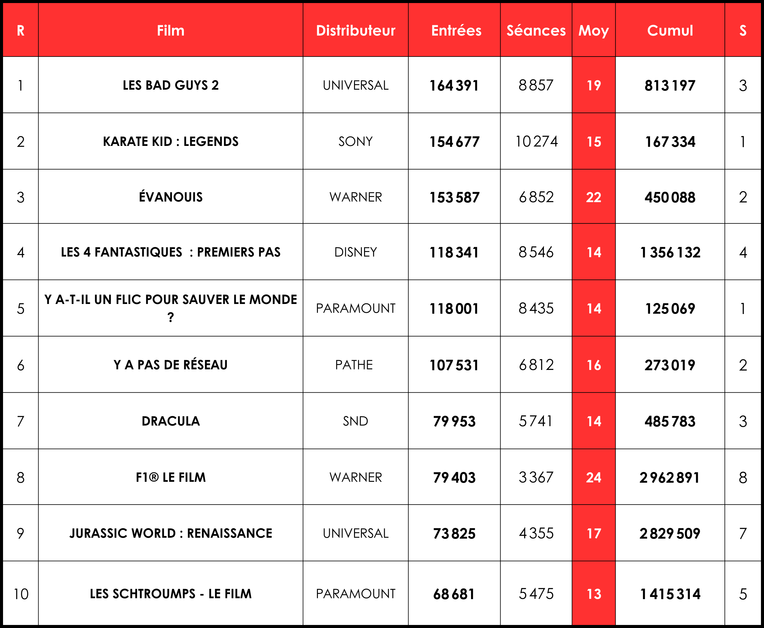 Si les sorties peinent à tirer leur épingle du jeu, les continuations sont en revanche plutôt stables, avec une baisse de 17 % en moyenne, pour un recul des séances de 20 %. La comédie de Pathé Y a pas de réseau affiche la meilleure tenue grâce à ses 107 000 tickets (-3 %), suivi des Bad Guys 2 et de F1. Ce dernier, avec ses 79 000 entrées (-7 %) et 24 e/s, réalise par ailleurs la meilleure performance à la séance du top 10. Il est suivi de Évanouis, également chez Warner, qui effraie 22 spectateurs par séance.