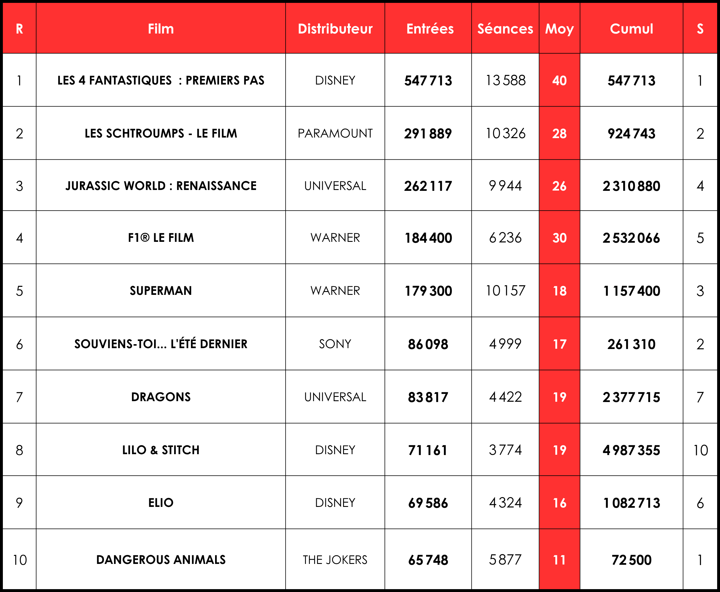 Les Quatre Fantastiques : Premiers Pas termine son premier week-end à 547 700 entrées, avec une moyenne de 40 entrées par séance (e/s). Il s’agit du septième meilleur lancement de 2025 après F1 – y compris en termes de moyenne par séance – dépassant donc le dernier Marvel, Captain America: Brave New World, qui bouclait un premier week-end à 534 500 billets (et 36 e/s) en février dernier. Ce nouvel opus connaît un succès équivalent à celui des 4 Fantastiques de 2015, qui avait enregistré 541 400 entrées au terme de son premier dimanche.