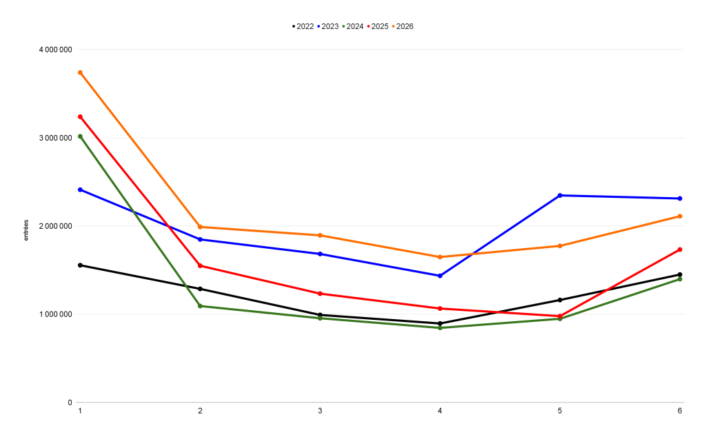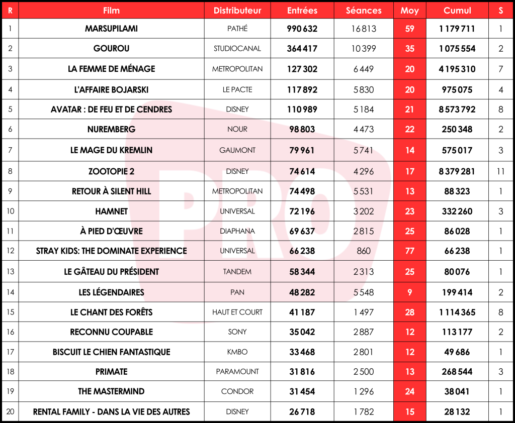 Parmi les continuations, Le Chant des forêts continue sa sérénade avec une baisse de seulement 24 % sur son huitième week-end, et une toujours très solide moyenne de 28 e/s. Le documentaire de Vincent Munier sorti le 17 décembre dernier totalise plus de 1,1 M d’entrées, dont 700 000 enregistrées sur 2026. Nuremberg affiche le plus faible recul du top 20 (-16 %), et totalise 250 000 tickets. Le drame historique de James Vanderbilt devrait dépasser dans les prochains jours les 300 000 entrées de Life of Chuck, pour devenir le plus grand succès de Nour. Même baisse pour Hamnet qui totalise 332 000 entrées, soit plus que Nomadland, de la même Chloe Zhao, au même stade (303 000 entrées, cumul à 620 000).