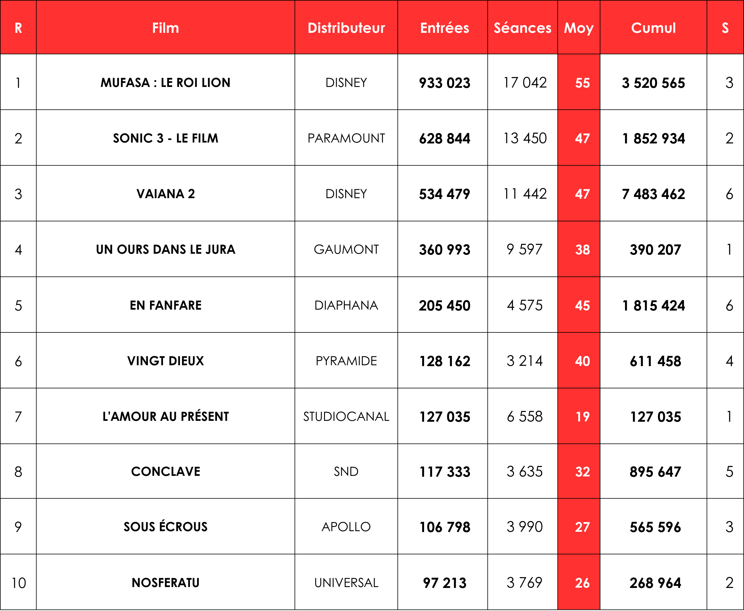 Mufasa : Le Roi Lion boucle son troisième week-end avec 933 000 entrées (-9 %), et un cumul à 3,5 millions (M). En 2024, seuls Vice-versa 2 (5,1 M) et Vaiana 2 (4,9 M) totalisaient autant de tickets au même stade. Le récit de l’ascension du père de Simba obtient également une moyenne de 55 entrées par séance (e/s), dépassée l’année dernière par seulement quatre films sur leur troisième week-end : Un p’tit truc en plus (78 e/s), Vice-versa 2 (74 e/s), L’Amour ouf (71 e/s) et Le Comte de Monte-Cristo (52 e/s).