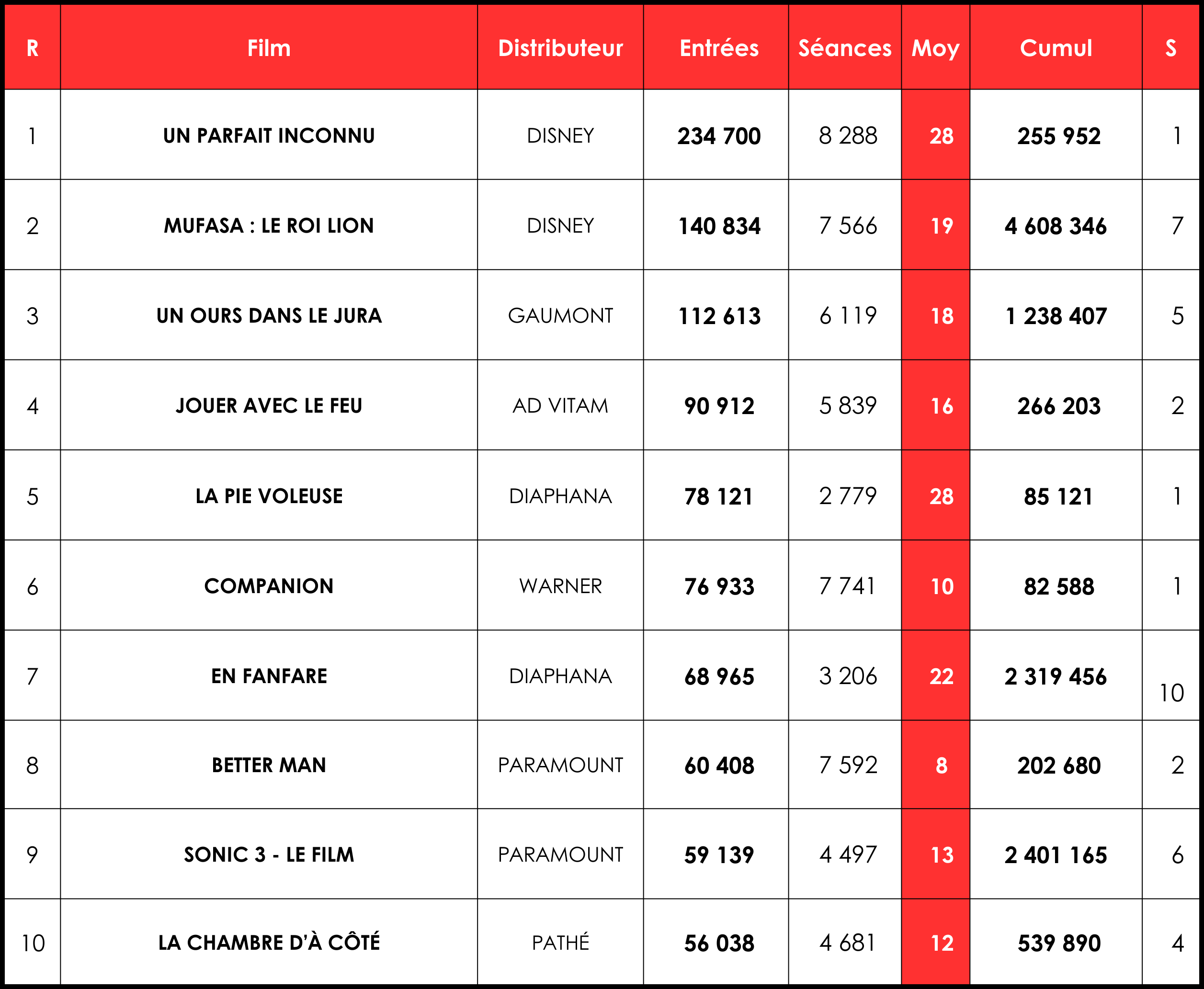 Pour la première fois depuis sept semaines, Mufasa : Le Roi Lion est détrôné, mais par un autre Disney, son successeur étant le roi Dylan-Chamalet. Un parfait inconnu de James Mangold compile 234 000 entrées (255 000 avec AP) pour 28 entrées par séance (e/s), soit la co-meilleure moyenne du classement. Ce démarrage n’égale toutefois pas celui de Back to Black, qui avait bouclé son premier week-end à 282 000 tickets pour 32 e/s (cumul à 1,1 M). La belle appréciation des spectateurs (4,1 étoiles sur AlloCiné) ainsi que l’arrivée prochaine des vacances d’hiver pourraient offrir une belle tenue au biopic. Deuxième nouveauté, La Pie voleuse attire 78 000 spectateurs (85 000 avec AP) pour 28 e/s, soit le meilleur démarrage pour un film de Robert Guédiguian depuis les 93 000 entrées de Gloria Mundi en 2019, qui s’était cependant contenté d’une moyenne de 23 e/s (cumul à 332 000). Dernière nouveauté du top 10, Companion peine à convaincre avec ses 76 000 billets pour 10 e/s. À titre de comparaison, Blink Twice, autre sortie d’horreur/thriller de Warner, avait réalisé 57 000 entrées pour 17 e/s (cumul à 300 000).