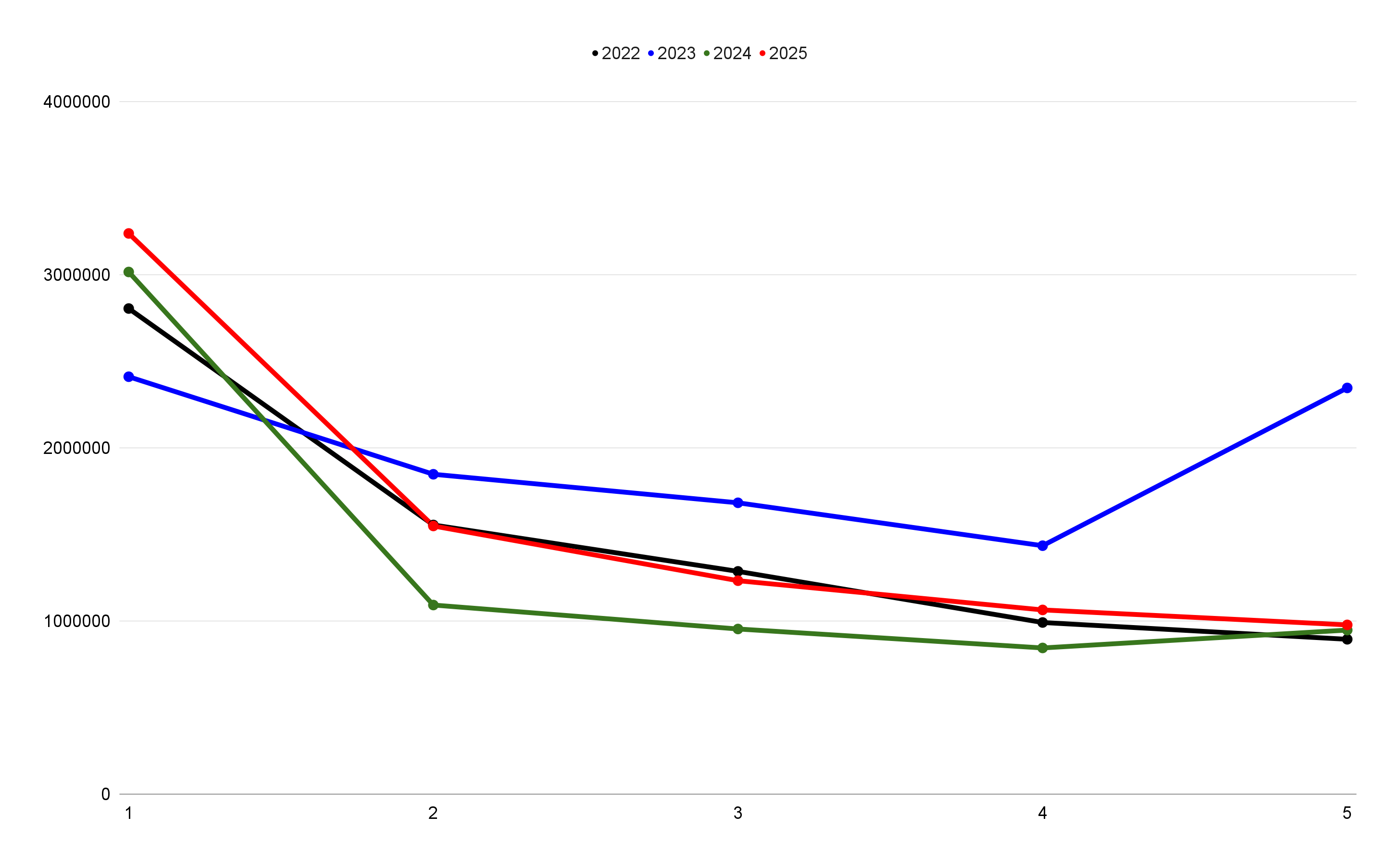 Avec 978 000 entrées, le top 10 au dimanche soir passe sous la barre du million pour la première fois depuis un an, nouvelle étape d’une fréquentation qui ne fait que baisser depuis les vacances de Noël ; en l’occurrence, le classement de ce week-end est en recul de 8 % par rapport à la semaine dernière. Et s’il reste 3 % au-dessus des entrées de la même période l’année dernière, il en enregistre 24 % de moins que le week-end équivalent de 2023, porté par le lancement d’Astérix et Obélix : L’Empire du milieu.
