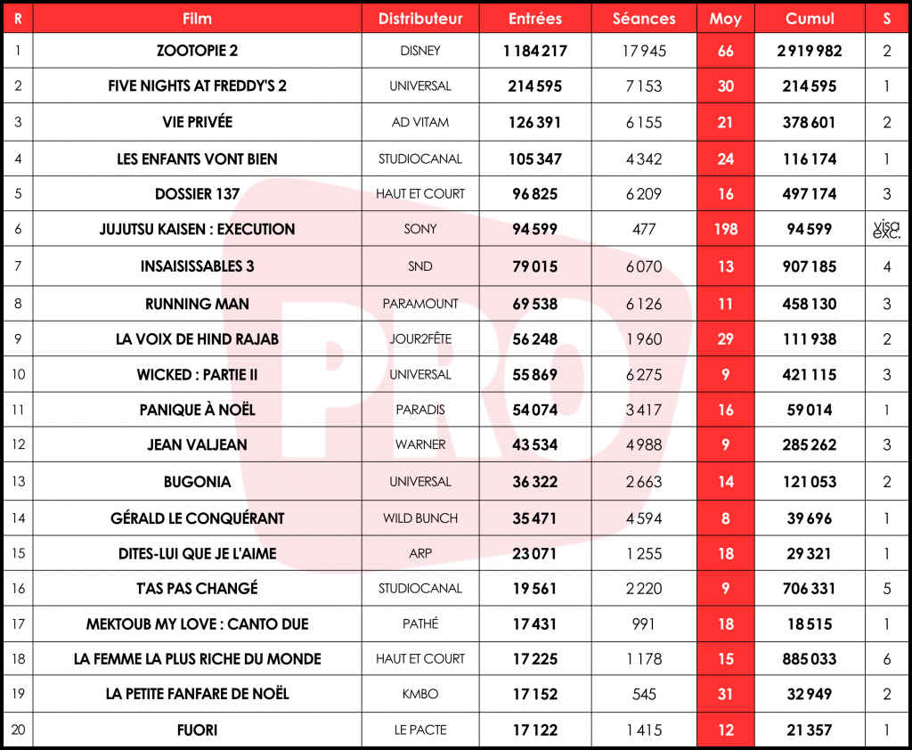 Box-office week-end : Zootopie 2 proche des 3 millions d’entrées
