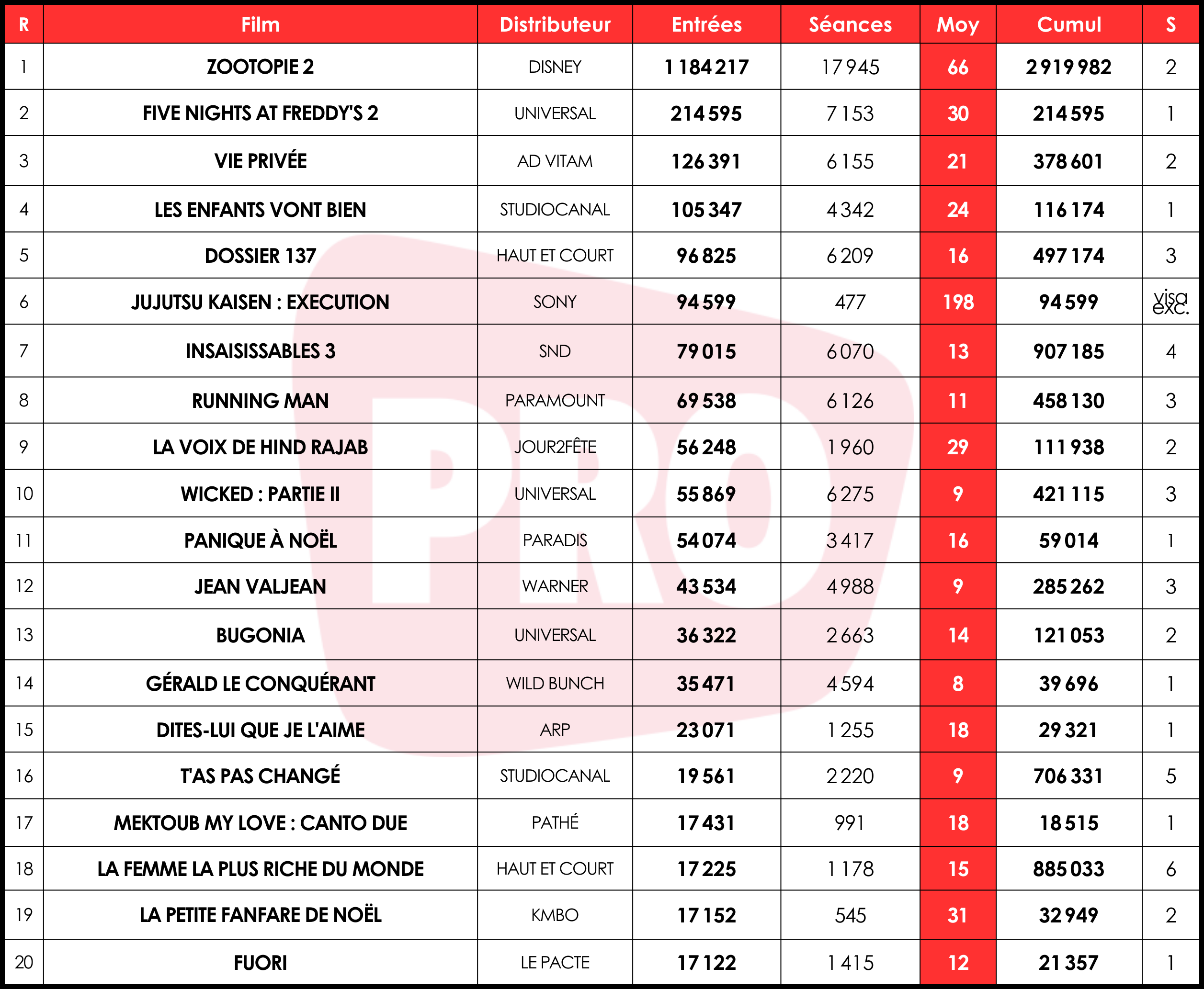 Autre résultat notable parmi les continuations : à la faveur d’une programmation renforcée (+34 %), La Petite fanfare de Noël écoule 17 000 entrées, soit +143 % par rapport au précédent week-end. Avec une solide moyenne de 31 curieux par séance, le film d’animation de KMBO cumule près de 33 000 billets.