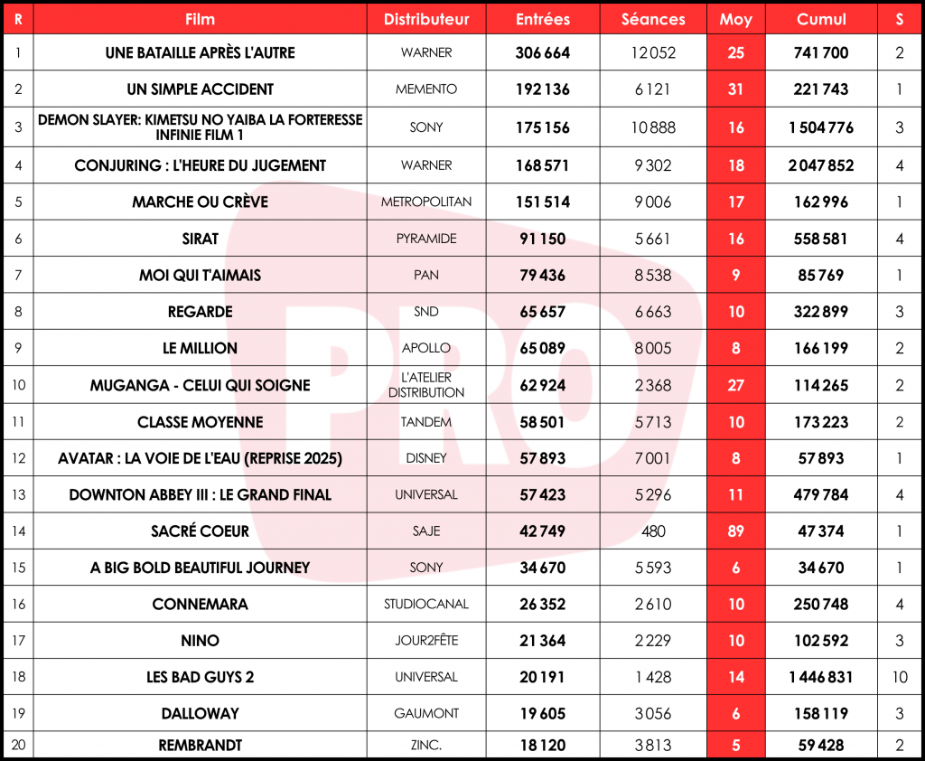 Solide continuation pour Une bataille après l’autre qui engrange 306 000 tickets (-27 %) pour 25 entrées par séance (e/s), et un cumul à 741 000. Aux côtés de récents blockbusters d’auteurs américains, le film de Warner surpasse Mickey 17 (683 000 entrées pour 17 e/s au même stade) ou encore The Fabelmans (569 000 entrées pour 23 e/s), égale Killers of the Flower Moon (323 000 entrées pour 29 e/s) et est devancé par Juré n°2 (835 000 entrées pour 26 e/s) ou encore Babylon (856 000 entrées pour 28 e/s). Le dixième long métrage de Paul Thomas Anderson devrait atteindre très prochainement le million de tickets, et devenir ainsi la neuvième sortie de Warner en 2025 à dépasser ce cap en France.