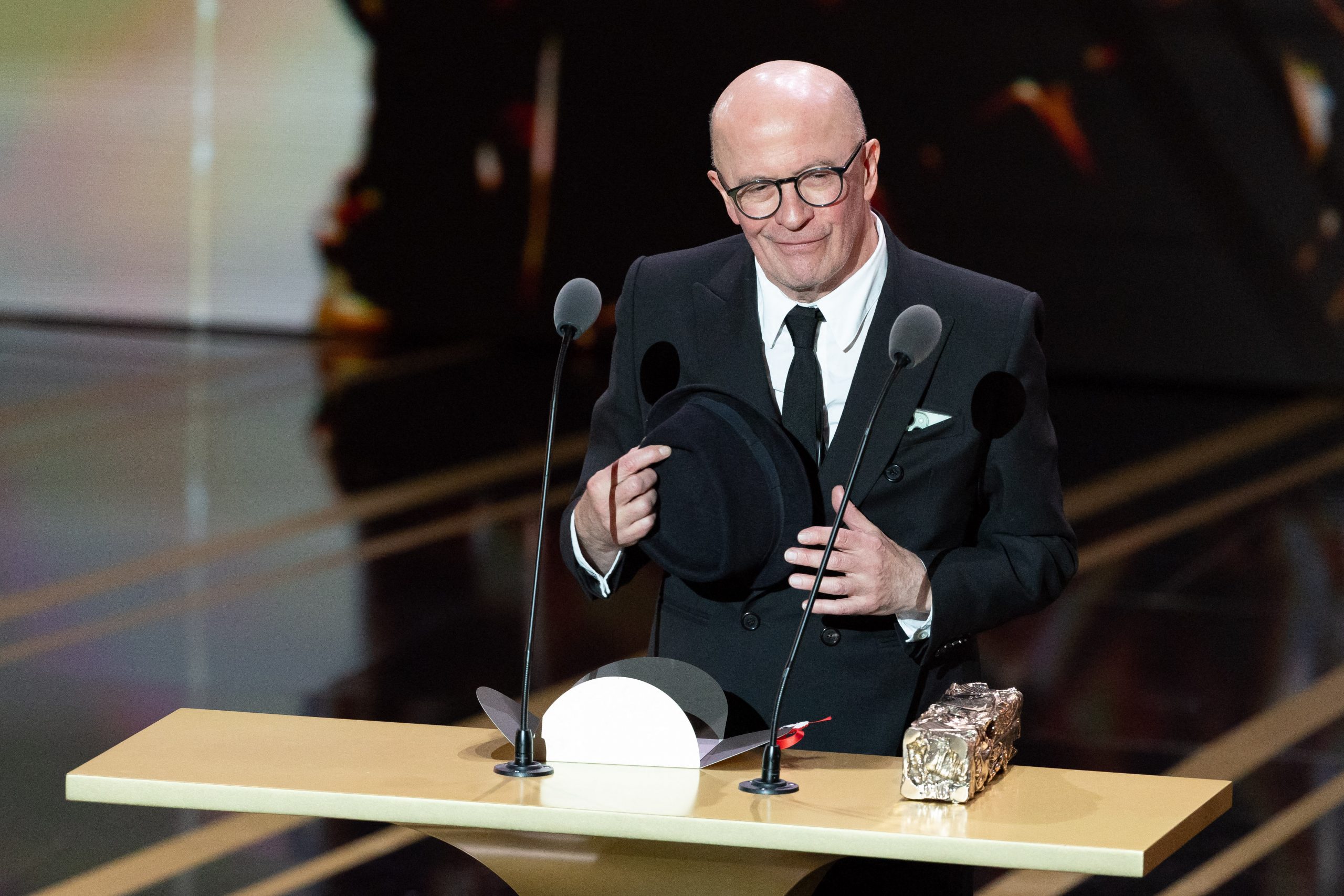 Jacques Audiard recevant le César de la meilleure adaptation pour Emilia Perez © Dominique Jacovides - Olivier Borde / Bestimage