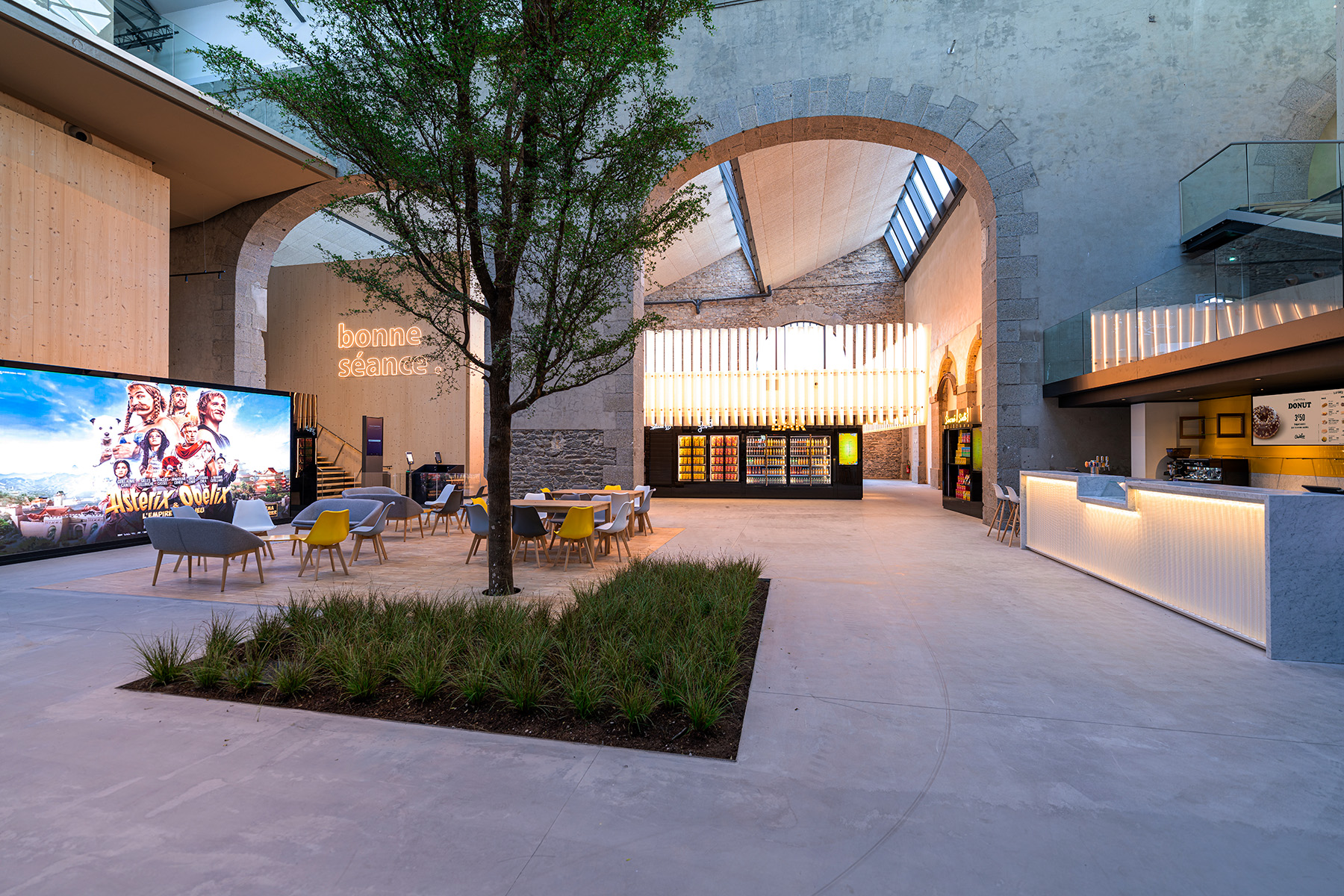 Premier clap imminent pour le Ciné Capucins, 77e établissement estampillé Pathé Cinémas à ouvrir en France métropolitaine. Conçu par l’architecte Pierre Chican, le bâtiment arbore un design industriel renforcé par les grandes arches en béton brut et les nombreuses verrières qui recouvrent les Ateliers des Capucins, baignant le hall d’une lumière naturelle continue. À l’instar du Pathé Dijon inauguré l’an passé, de larges lames de verre ajoutent une touche de style plus chaleureuse à l’intérieur. L’espace d’accueil se compose d’un coin confiserie en libre service et d’un comptoir Charlie’s, l’offre gourmande de Pathé, qui propose hotdogs et donuts, mais aussi des boissons chaudes et bières pression locales. Enfin, des bornes et portillons automatiques d’accès aux salles complètent le parcours 100 % digital du spectateur.