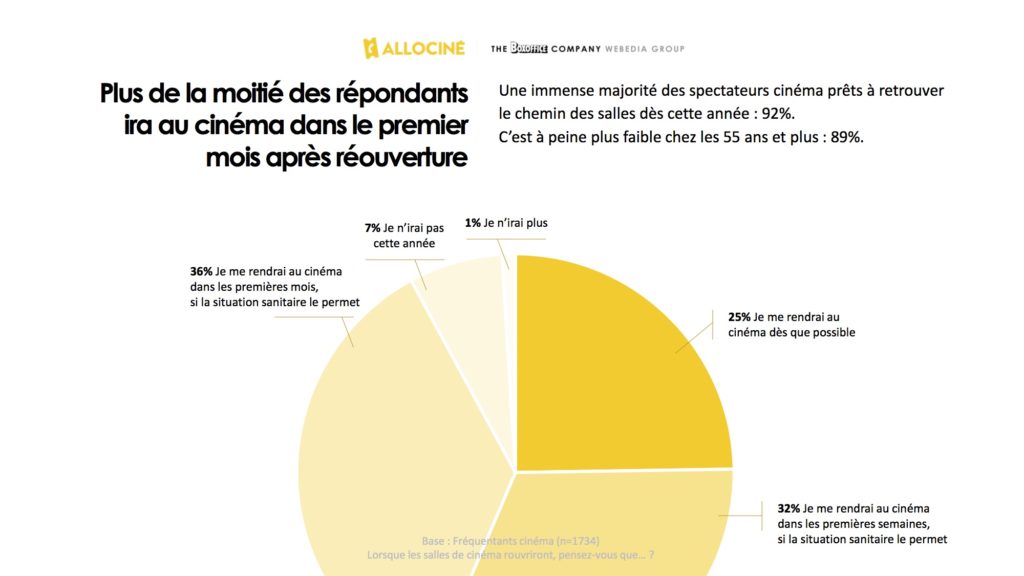 Mais loin d’être contradictoire, l’envie de cinéma en salle semble être intacte. Sur une échelle de 1 à 5, l’attente de la réouverture des cinémas obtient ainsi une note moyenne de 4,1 (4,8 pour les assidus et 4,5 pour les réguliers), y compris chez ceux qui se sont beaucoup rabattus sur le divertissement à domicile. Une immense majorité des spectateurs cinéma (92 %) est prête à retrouver le chemin des salles cette année. Ce chiffre est à peine plus faible chez les plus de 55 ans (89 %). Ils sont même plus de la moitié à déclarer qu’ils iront au cinéma dans les premières semaines de leur réouverture, 25 % souhaitant s’y rendre dès que possible (tendance qui s’élève à 52 % chez les assidus et 33 % chez les réguliers). Enfin, 91 % des répondants souhaitent garder le contact avec l’univers du cinéma en salle et souhaitent en savoir d’ores et déjà plus sur les films qui seront à l’affiche à la réouverture.