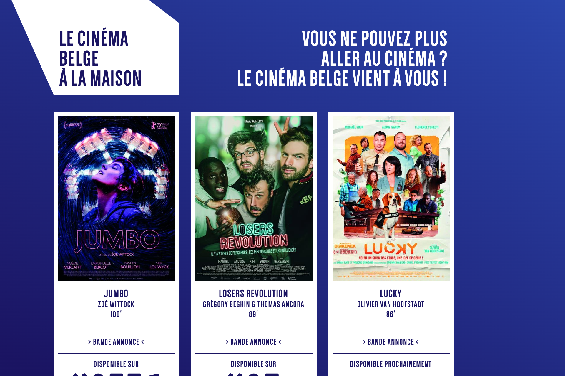 Quatre de ces films ont vu leur exploitation en salles interrompue – Filles de joie de Frédéric Fonteyne et Anne Paulicevich et Lucky d’Olivier Van Hoofstadt en tête –, tandis que les sorties de Jumbo de Zoé Wittock (prévue le 18 mars) et Losers Revolution de Thomas Ancora et Grégory Beghin (prévue le 11 mars) ont été annulées. Suite à une entente entre producteurs, distributeurs et diffuseurs, ces œuvres sont désormais proposées en VOD, accessibles via le site lecinemabelgealamaison.be spécialement créé à cette occasion. Une démarche complémentaire à l’initiative, quelques jours plus tôt, de certains distributeurs indépendants de mettre à disposition leurs films en VOD.