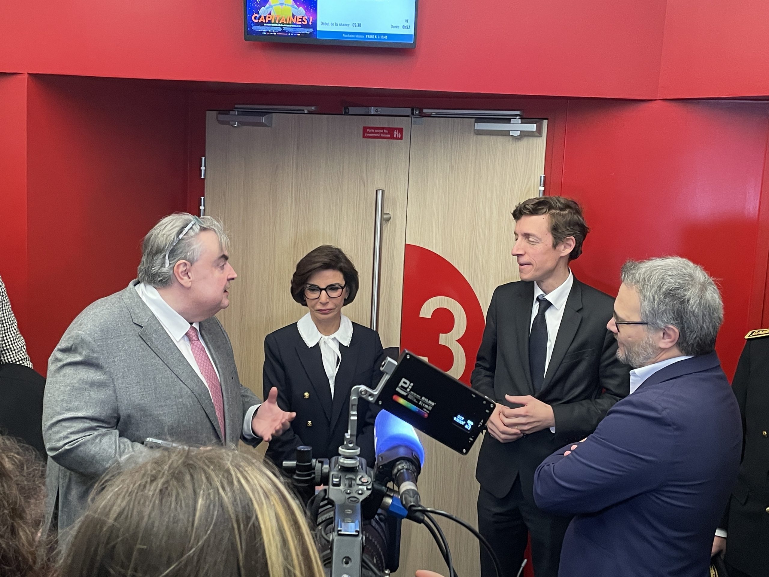 Rachida Dati, ministre de la Culture, et Édouard Geffray, ministre de l'Éducation nationale, entourés de Richard Patry, président de la FNCF, et Guillaume Bachy, président de l'AFCAE, ce mardi 25 novembre à Créteil (Val-de-Marne) © Jules Dreyfus/Boxoffice Pro