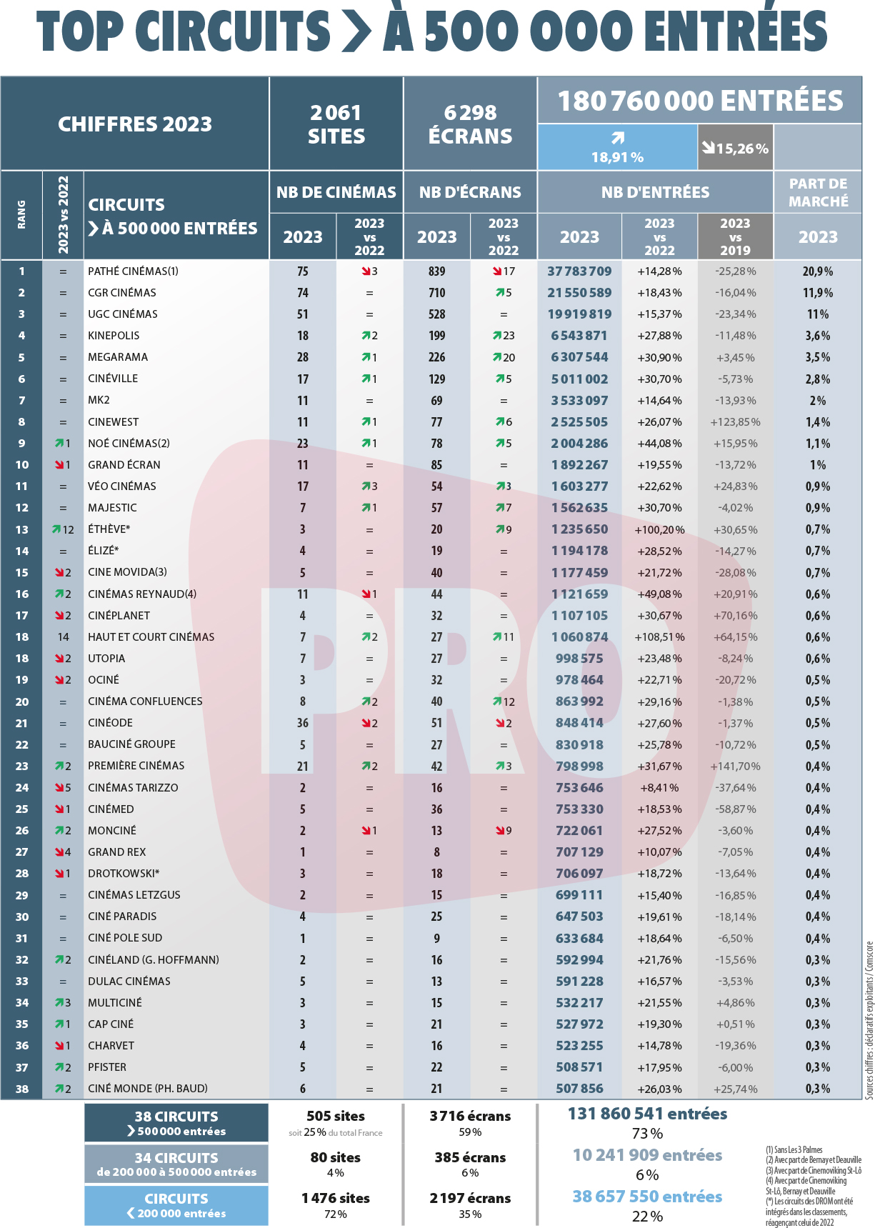 18./ Bel exercice 2023 pour Haut et Court Cinémas dont la fréquentation a doublé (+108,5 %) en un an et qui gagne ainsi 12 places dans le classement (30e à 18e). Le résultat d’une politique d’acquisition ciblée pour le réseau art et essai dirigé par Martin Bidou, qui s’est s’emparé du Navire de Valence au printemps, après avoir racheté le Diagonal de Montpellier fin 2022, qui a donc bouclé sa première année pleine sous son nouveau pavillon, avec 350 000 entrées. À noter que le groupe est le 18e circuit tricolore a passer la barre du million de spectateurs en 2023.