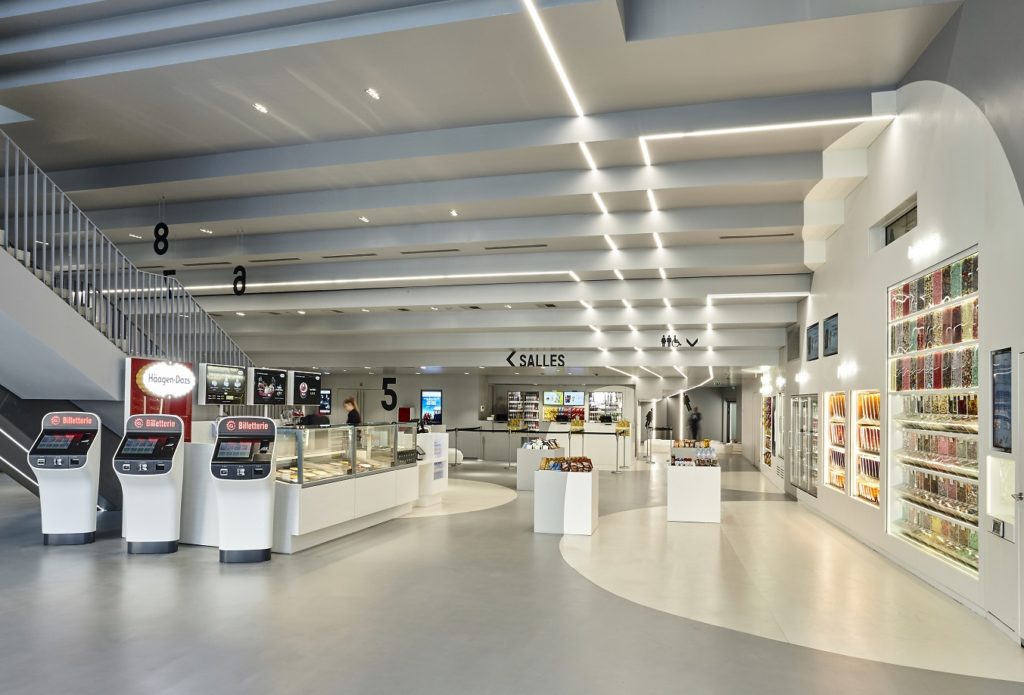 Réinventer la salle et une toute nouvelle façon d’aller au cinéma, c’est aussi tout le défi que s’était donné l’architecte Manuelle Gautrand pour son premier projet dans le domaine de l’exploitation cinématographique. « Et force est de constater qu’elle a vu très juste », se réjouit Cleveland. Aujourd’hui, le cinéma dispose de huit salles (contre sept avant travaux), pour une capacité d’accueil sensiblement équivalente de 1 364 fauteuils, et dont la plus grande, équipée en Dolby Atmos et d’un écran de 16 mètres de base, rassemble à elle seule 445 places. Mais comment gagner de la surface dans l’espace restreint de l’ancien cinéma, implanté au sud du 14ème arrondissement parisien? « En descendant à 8,50 mètres sous terre, ce qui nous a permis d’implanter quatre salles au niveau-1 (la technique étant lotie au niveau-2), et de dégager le hall, pour créer un véritable espace de convivialité, de transparence », détaille le directeur. Ainsi, sur les niveaux supérieurs, où sont disposées les 4 autres salles (dont la plus grande qui occupe presque deux niveaux), on peut se promener le long des parois en verre et profiter d’une vue dominante sur Paris.
