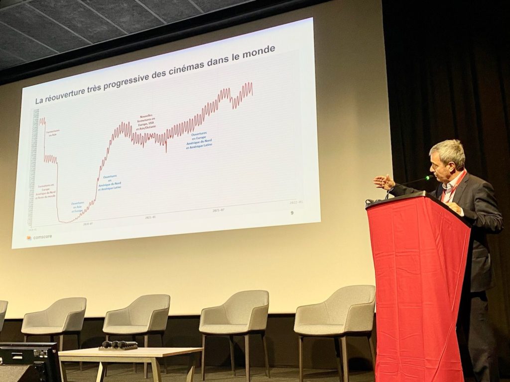 De chiffres et de recettes, il en a d’ailleurs été question dans la présentation qui a suivi. « En 2021, on a démarré plus tard en France mais remonté plus vite », a noté Eric Marti, le président de Comscore France, qui a mis en exergue une sortie de crise différenciée entre les marchés cinématographiques français et américain : le stop and go d’un parc uni en France, une réouverture très progressive outre-Atlantique, et globalement « une capacité de rebond exceptionnelle » du secteur, « les seuls obstacles étant liés aux mesures sanitaires » . Après la chute de 70 % du marché mondial en 2020, Comscore estime que 2021 représentera 50 % des chiffres de 2019, avec une perspective de reprise du marché mondial en 2023 et 2024 reposant sur l’offre internationale. Des prévisions « sans reprise de la pandémie, et sans remise en cause fondamentale de la fenêtre salle », souligne Eric Marti. Car la chronologie est bien entendu un sujet majeur de préoccupation, alors que des accords interprofessionnels bilatéraux changent encore chaque semaine aux États-Unis entre les salles et les studios. Le président de Comscore France observe en outre « qu’une sortie salle/plateforme simultanée entraîne une érosion de la fréquentation en 2e et 3e semaine, plus encore qu’elle n’impacte son démarrage ». Une obsolescence accélérée des films en salle que propose d’évaluer le nouvel outil Movies Everywhere de Comscore, qui « permettra de mesurer l’impact de la VOD Premium et du streaming sur le box-office des films dans le monde ».