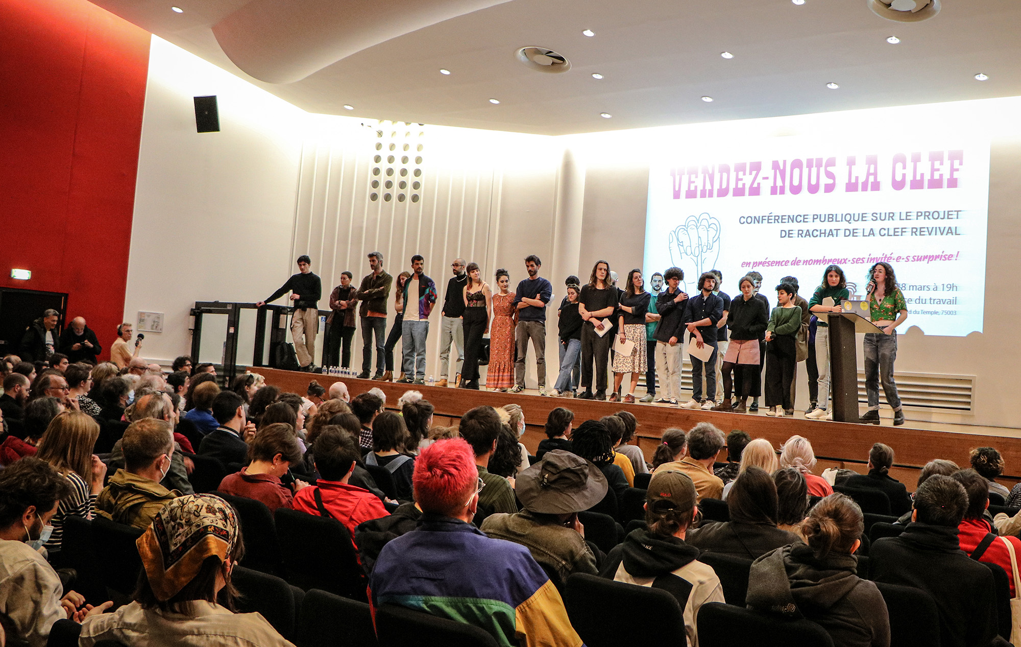 Lundi soir, peu après 19 heures, plus de 200 personnes sont venues se masser dans l’auditorium de la Bourse du Travail, aux environs de la Place de la République. L’ambiance est enthousiaste et volontaire lorsque surgissent sur l’estrade, après un petit film retraçant les mois d’occupation, la plupart des membres de La Clef Revival. Aux premiers remerciements devant ce public nombreux, le collectif enchaîne par quelques chiffres : 882 jours d’occupation consécutifs depuis septembre 2019, plus de 1 000 films projetés, 200 personnalités invitées et, depuis l’annonce d’une possible expulsion le 22 janvier 2022 jusqu’à celle, effective du 1er mars, une « mobilisation sans précédent » avec quelque 9 000 cinéphiles réunis pendant les cinq semaines de portes ouvertes.