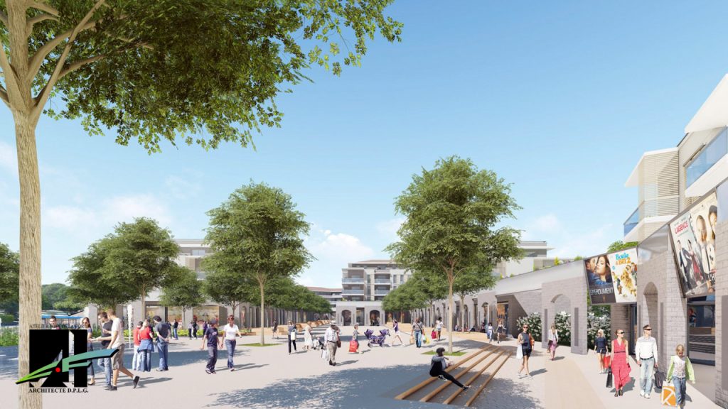 Le cinéma (à droite) s’intègre au sein du futur « Cœur de Mougins », comprenant logements, commerces et espaces de restauration aménagés sous les arcades autour d’une place. Un projet piloté par Altarea Cogedim © Cœur de Mougins