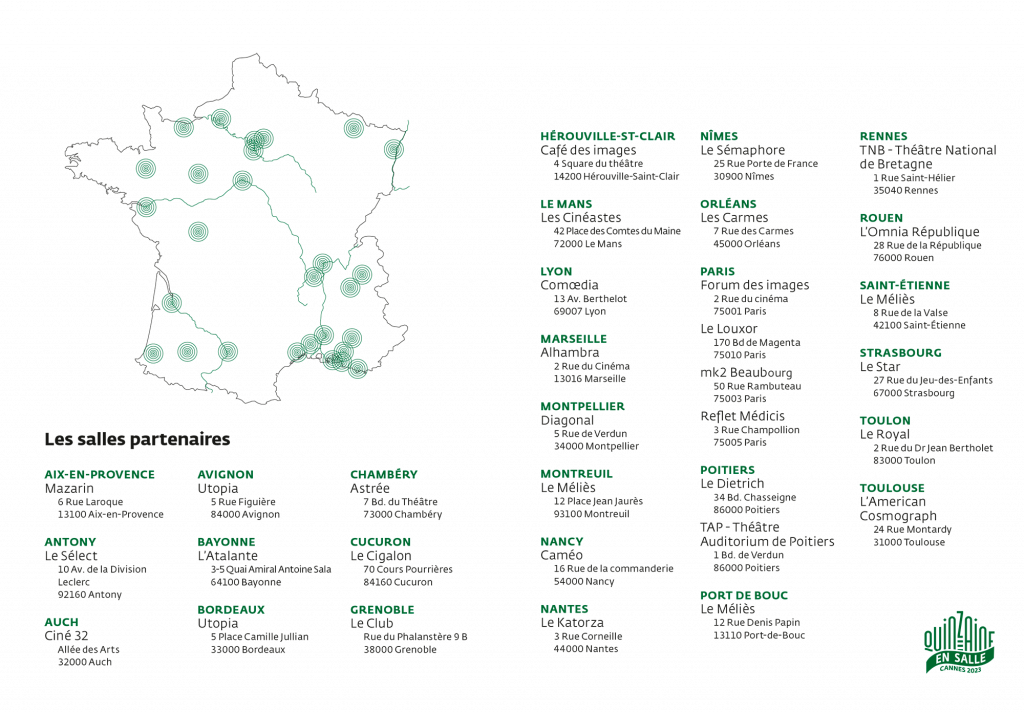 L’opération, nommée “La Quinzaine en salle”, se déroulera du 7 au 18 juin 2023, soit dix jours d’avant-premières dans la foulée du Festival de Cannes, « afin de vous faire vivre la Quinzaine comme un festival près de chez vous », promettent les organisateurs.