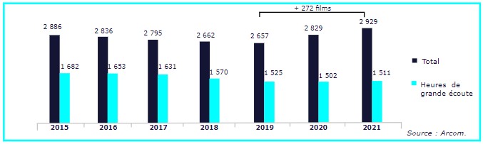 Nombre total de diffusions d’œuvres cinématographiques (télévision nationale gratuite) – 2015-2021