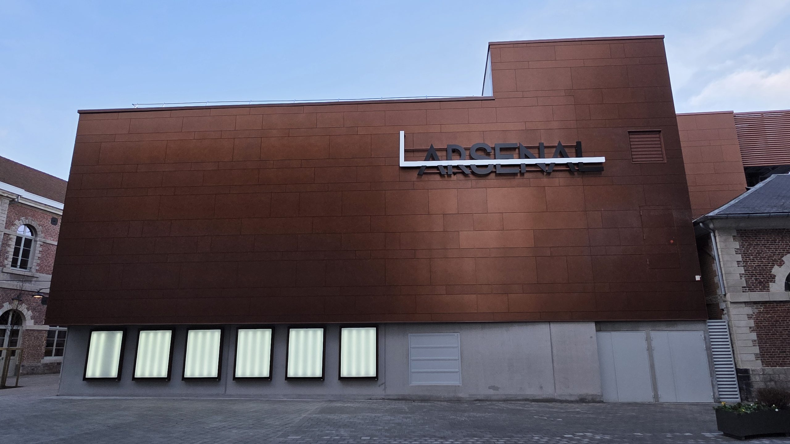 Si le site offre un cachet indéniable, il impose aussi ses contraintes. Le projet initial prévoyait d’investir le grand bâti de l’arsenal, après de longues fouilles archéologiques. Mais l’arrivée du Covid a marqué un coup d’arrêt et, au sortir de la crise, la hausse des coûts de construction a remis en cause la faisabilité du dossier. « Le devis de l’époque reposait sur un projet ambitieux et technique. Nous avons décidé de l’abandonner pour ne plus nous concentrer sur l’arsenal même, mais se servir de sa disposition en U pour envelopper les salles construites dans un bâtiment neuf. » À nouveau validé en CDACi fin 2023, le résultat final, dont la conception a été accompagnée par Gilbert Long et l’exécution confiée à Mélanie et Daniel Desforges, du cabinet Kase Architecture (déjà à l’œuvre sur le Cin’Amand), est un mélange d’ensemble neuf et de réhabilitation, pour un budget supérieur à 8 M€. Comme un hommage, le complexe arbore un bardage couleur bronze pour rappeler l’identité militaire du lieu.