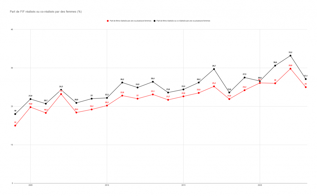Olivier Henrard rappelle également que de nombreux effectifs au sein des formations en cinéma, audiovisuel et jeu vidéo se sont féminisés, à l’instar de ceux de La Fémis et de l’École supérieure de réalisation audiovisuelle (Esra). Par ailleurs, plus de 105 films réalisés par des femmes ont bénéficié de l’aide à la numérisation des œuvres : « Les chefs d’œuvre de Musidora, Yannick Bellon, Agnès Varda, Germaine Dulac, Jacqueline Audry, Claire Simon, Claire Denis, pour ne citer qu’elles, ont ainsi pu trouver une seconde vie et féminiser durablement notre imaginaire collectif cinématographique. » Et, bien évidemment, sur ces dernières années, ce sont les réalisatrices qui ont particulièrement fait le cinéma français à l’international, avec de multiples récompenses dans des festivals prestigieux, entre les Palmes d’or Titane de Julia Ducournau (2021) et Anatomie d’une chute de Justine Triet (2023), le Lion d’or L’Événement d’Audrey Diwan (2021) et l’Ours d’or Dahomey de Mati Diop (2024).