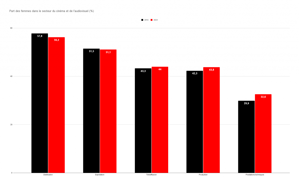 En 2023, 108 705 des 248 166 salariés des secteurs cinéma et audiovisuel étaient des femmes, soit une part stable de 43,8 % par rapport à 2022 (+0,2 %), et supérieure de 1,1 % par rapport à 2019. Les principales progressions depuis 2019 sont observées dans les filières de la production et des prestations techniques, avec respectivement +1,5 % et +2,7 % depuis la période prépandémique. En outre, la distribution et l’exploitation, malgré une baisse des femmes dans leurs effectifs depuis quatre ans (respectivement -1,6 % et -0,4 %), restent majoritairement féminines.