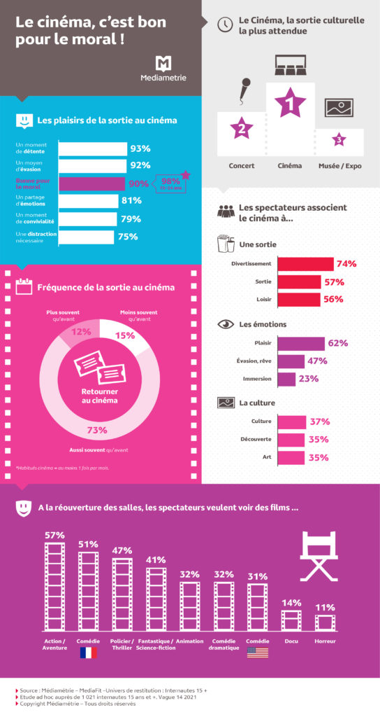 « Ces résultats témoignent du goût fort, permanent et ancré du public pour la sortie au cinéma et l’expérience unique qu’elle représente », rappelle Marine Boulanger. Selon la directrice du pôle cinéma de Médiamétrie, « Cette envie, signe d’un retour à une vie normale, correspond à des besoins profonds des Français, encore plus marqués après une année de crise sanitaire ».