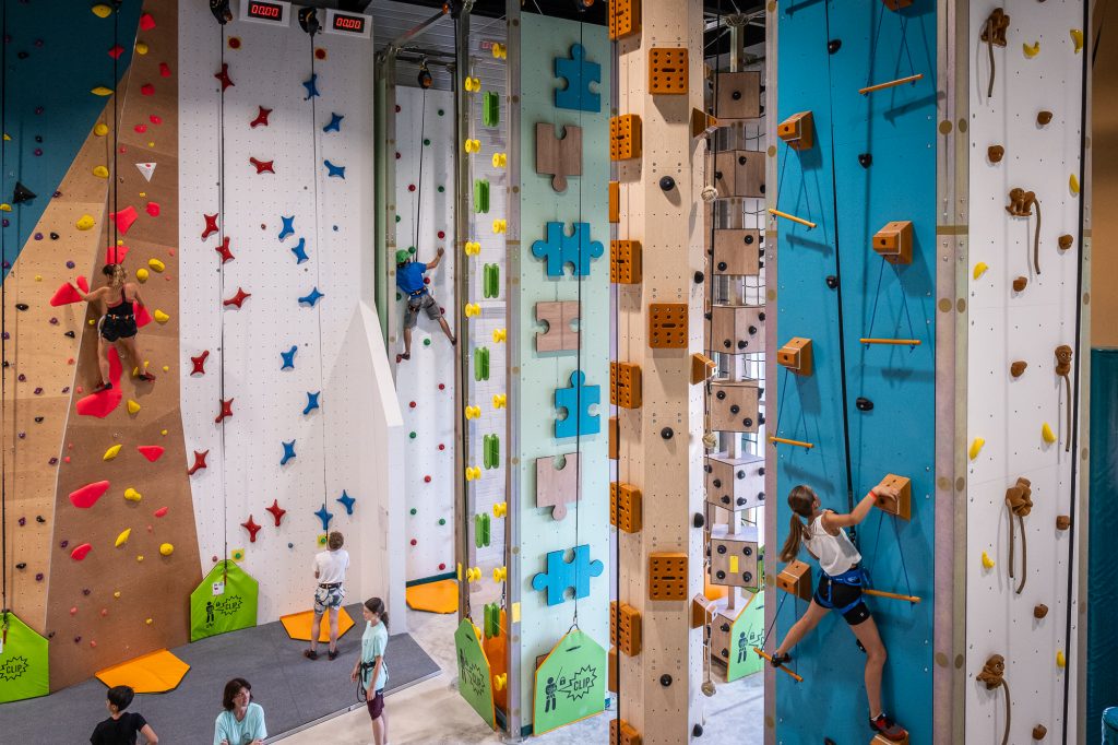 Techniquement, le projet implique de couler une dalle en béton et de réaliser des calculs de charges inédits, avec un poids concentré sur l’emprise au sol réduite des murs d’escalade. Ces derniers sont des plus variés, entre blocs, voies classiques, voies de vitesse, voies pour enfants… et une voie encore plus ludique qui permet aux grimpeurs de se livrer à des jeux rétro projetés. Côté sécurité, les dirigeants ont opté pour des enrouleurs automatiques, qui ne nécessitent pas de supervision particulière après le briefing de consignes de 15 minutes par lequel débutent toutes les sessions, accessibles à tous les âges et à tous les niveaux. À noter que l’établissement proposera aussi, bientôt, des cours en collaboration avec une école d’escalade.