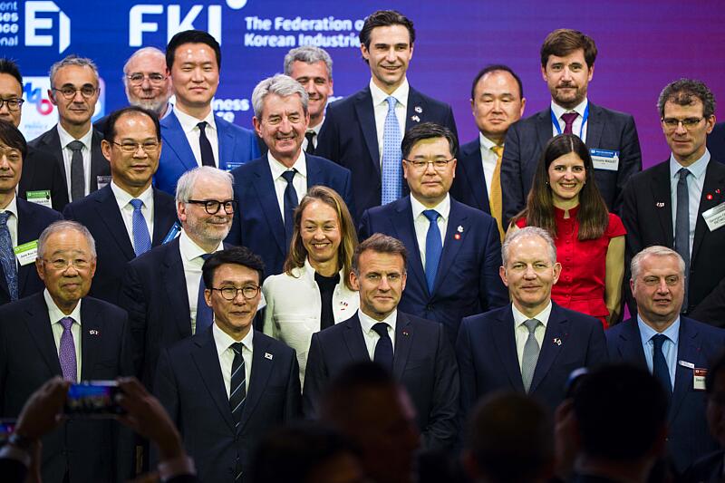Emmanuel Macron, le 3 avril 2026 à Séoul, au 3ème "Dialogue Economique France - Corée pour notre avenir", où a été annoncé le Sommet international du cinéma et de l'image animée. © Jintak Han/ZUMA Press Wire