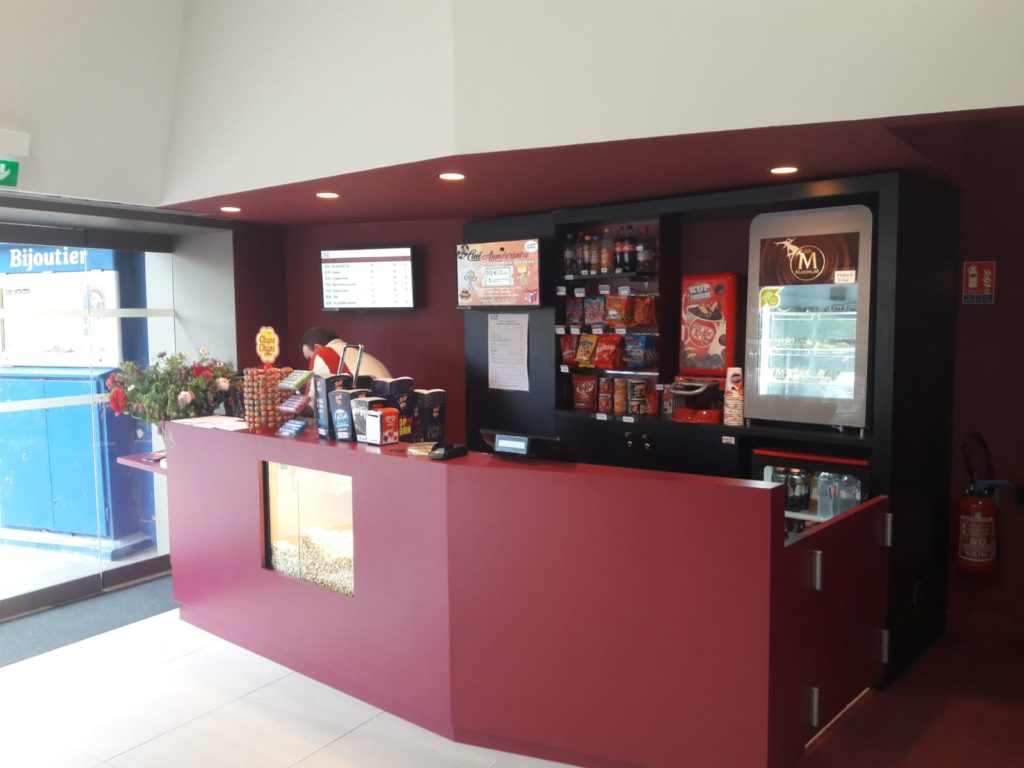 Ainsi le hall a pu être agrandi de 15 m2, sur une totalité de 50m2, en repoussant les portes d’entrées. La caisse principale a été déménagée sur le côté avec un comptoir double poste, permettant de gagner la place nécessaire à la création d’un espace détente, le tout dans des couleurs gris et rouge basque. Les sanitaires ont également été totalement refaits. Quant à la façade extérieure, 9 caissons 120×160 ont été installés ainsi qu’un écran led pour annoncer les événements.