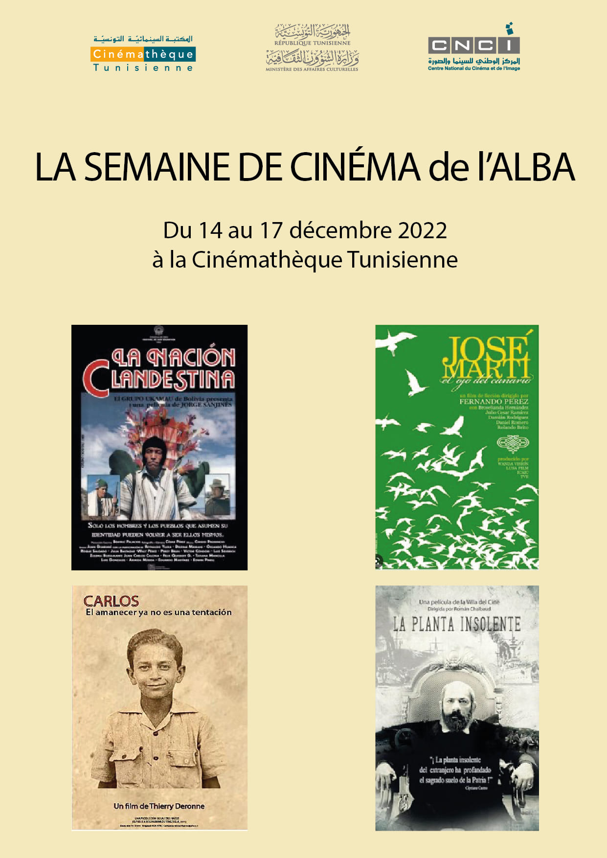 Par ailleurs, à l’occasion du centenaire de la sortie du premier film tunisien Zohra, réalisé par Albert Samama Chikly, le 21 décembre 1922, la Cinémathèque accueillera les 20 et 21 décembre les journées d’étude « Zohra, 100 ans après », pour un programme composé de conférences, tables rondes et projections.