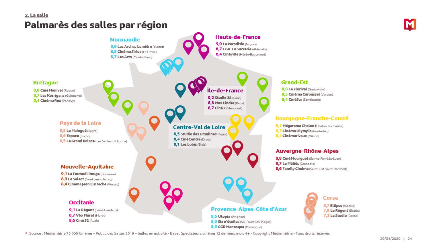 Malgré leur intérêt croissant pour la SVOD – près de 38 % regardant, en 2019, aussi des programmes sur les plateformes –, les spectateurs de cinéma restent très attachés à leurs salles, leur attribuant même sur l’année écoulée la meilleure note moyenne jamais atteinte : 7,9/10. Ainsi, de nombreux cinémas de l’ensemble du territoire recueillent d’excellentes notes grâce à leurs initiatives en matière d’accueil et de proximité, de confort et de modernité ou encore de programmation. Médiamétrie souligne par ailleurs que les spectateurs sont attirés par des salles de plus en plus innovantes et offrant toujours plus de services (espaces détente, snacking…).